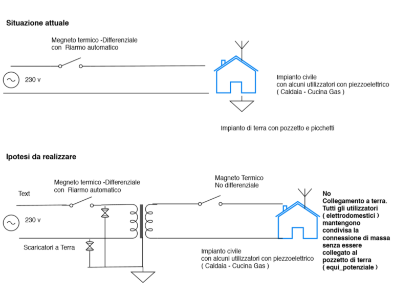 «Mi sono permesso di realizzare uno schema di principio funzionale per poter meglio spiegare e dare modo di comprendere i dettagli del mio quesito. Lo schema qui presente rappresenta lo status attuale e l’ipotesi da realizzare. La posizione dicotomica con il professionista contattato è quella che in virtù dei carichi (elettrodomestici) a valle del trasformatore…