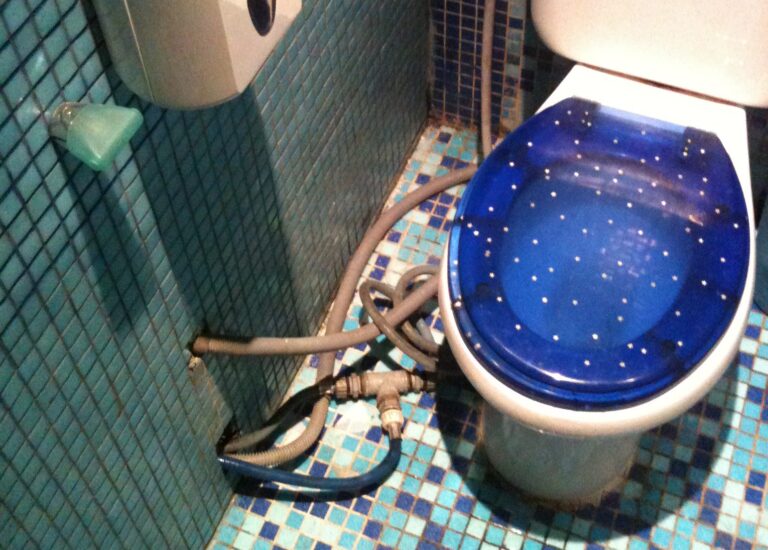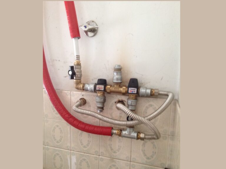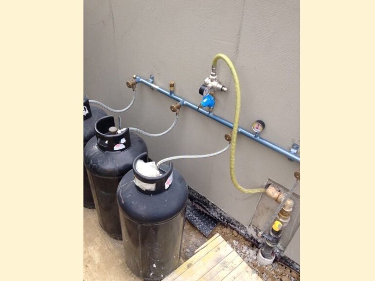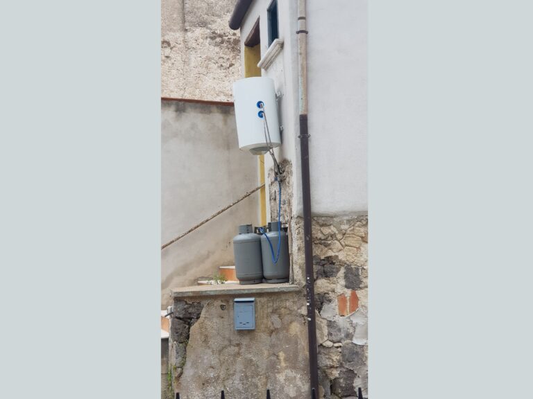 Bombole collegate con tubo in gomma, raccordi zincati e scaldabagno orizzontale da interno installato “in verticale”… sotto la pioggia!