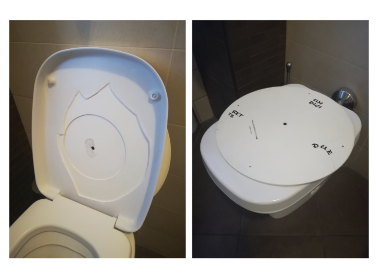 Tavoletta del wc riparata con un vecchio orologio da parete incollato col silicone…