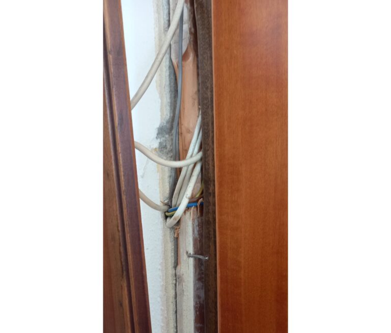 Ecco un impianto antifurto filare passato completamente tra il falso telaio e il coprifilo della porta con tanto di cordine unifilari con alimentazione 230 V x la centrale.