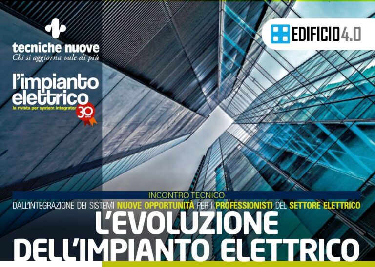 L’Impianto Elettrico, storica rivista della collana Impianti di Tecniche Nuove, in occasione del suo 30° anno di pubblicazione, il 21 giugno 2017, presso la sede di Tecniche Nuove a Milano, organizza il convegno “L’EVOLUZIONE DELL’IMPIANTO ELETTRICO – Dall’integrazione dei sistemi nuove opportunità per i professionisti del settore elettrico”.