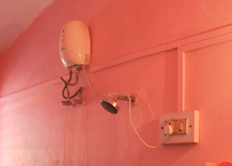 Nella camera di un hotel in India lo scaldaacqua elettrico della doccia è alimentato dal cavo appoggiato sul soffione e accanto alla presa il relativo interruttore: l’impianto elettrico è esterno al muro senza alcuna protezione.