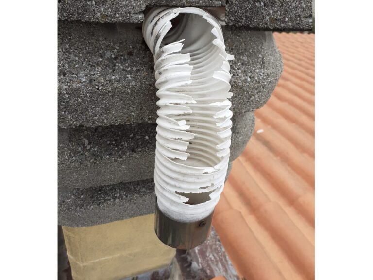 Foto di un terminale per condensazione… Se la plastica PPE non è certificata per uso esterno un motivo ci sarà! Inoltre, a un tubo flessibile sono concessi spostamenti sull’asse fino a 45 °C e qui siamo all’inversione a U! Vogliamo parlare dell’uscita a favore di vento?
