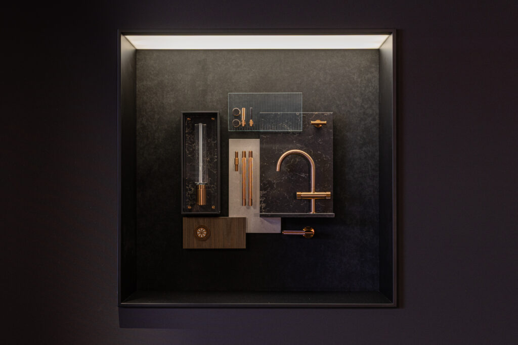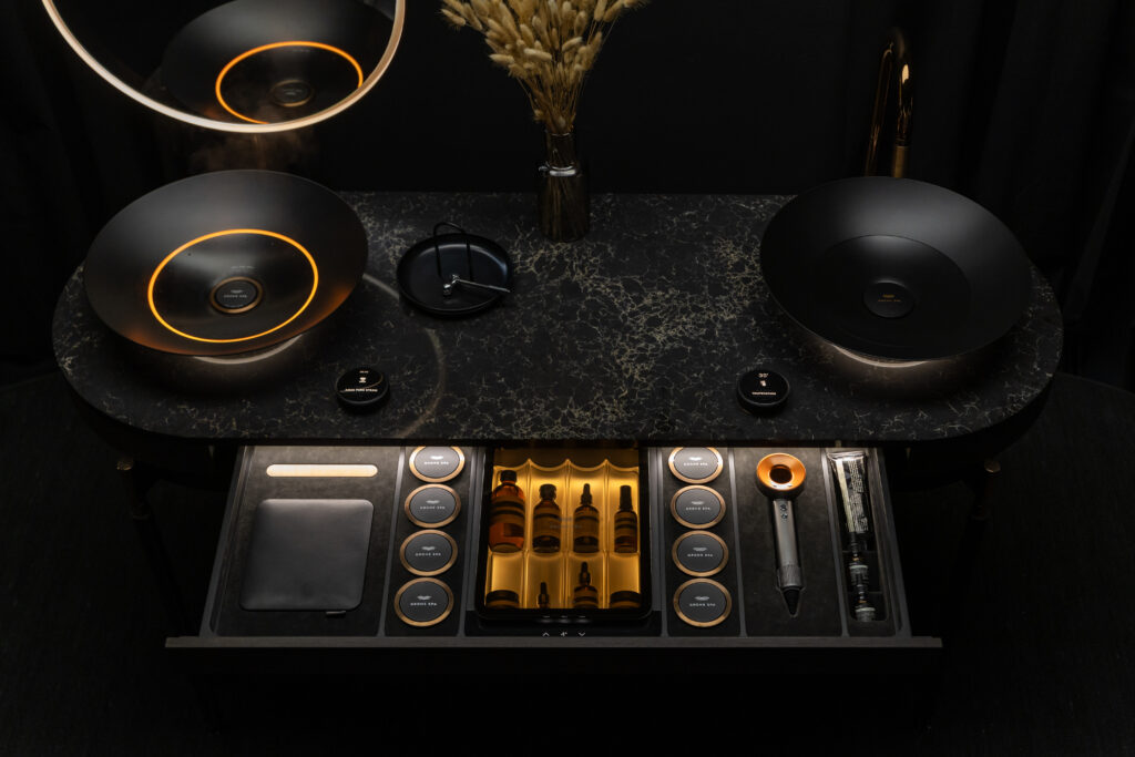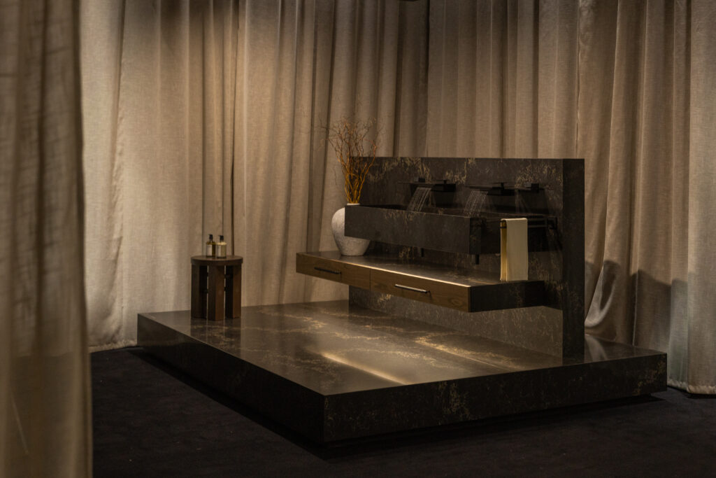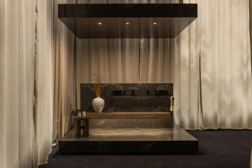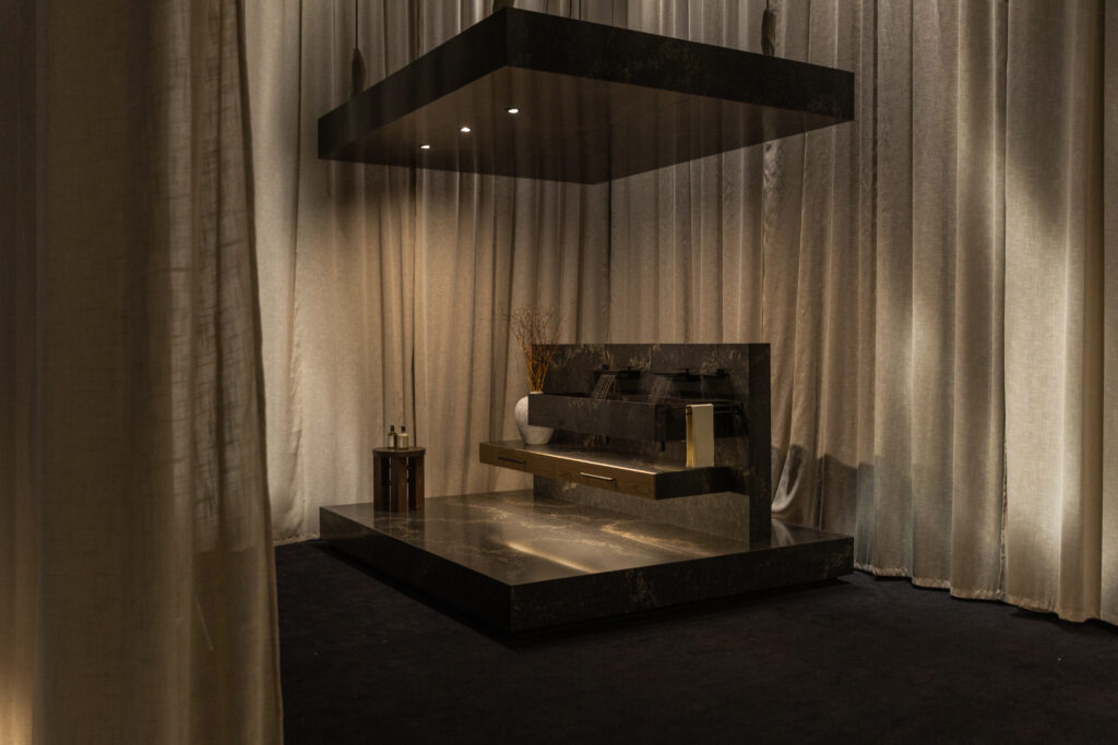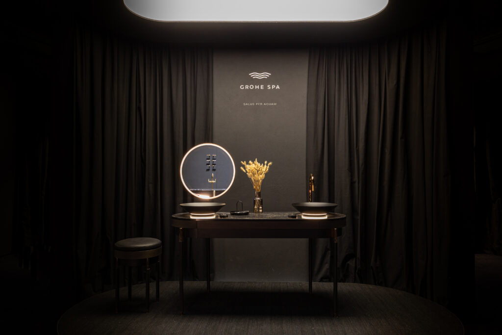 Il secondo ambiente reinterpreta il bagno come uno spazio progettato con precisione curatoriale, che offre ad architetti e designer nuovi strumenti per creare ambienti coerenti, capaci di ridefinire gli interni e stimolare un’interazione emotiva. Al centro della scena, incorniciata da una cascata continua, Grohe Atrio Private Collection unisce materiali premium, finiture sofisticate e maniglie impreziosite da inserti in quarzo. Attraverso la partnership con la prestigiosa firma di design Buster + Punch, Grohe SPA estende la personalizzazione all’intero spazio bagno, integrando componenti in metallo, illuminazione e soluzioni per l’acqua in una sintesi estetica perfetta. Il percorso si conclude con un’area dedicata alla cura di sé: il concept Grohe SPA Private Collection Vanity che introduce una nuova visione del bagno in cui l’acqua incontra il design multisensoriale, integrando elementi come vapore, nebulizzazione e aromaterapia per favorire una profonda esperienza di benessere olistico.