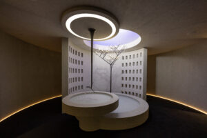 Il percorso attraverso Grohe SPA Aqua Sanctuary si sviluppa in tre ambienti simbolici – i Sanctum – che guidano il visitatore in un’esperienza immersiva tra acqua, materiali e architettura.
