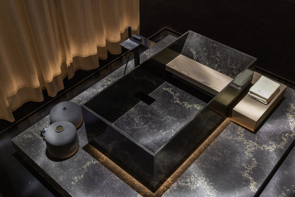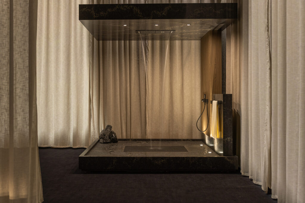 Il percorso culmina nel terzo Sanctum, uno spazio che esprime una sintesi tra artigianalità, innovazione e sperimentazione sulle superfici, dedicato ai tre rituali essenziali dell’acqua: preparazione, relax e rigenerazione.