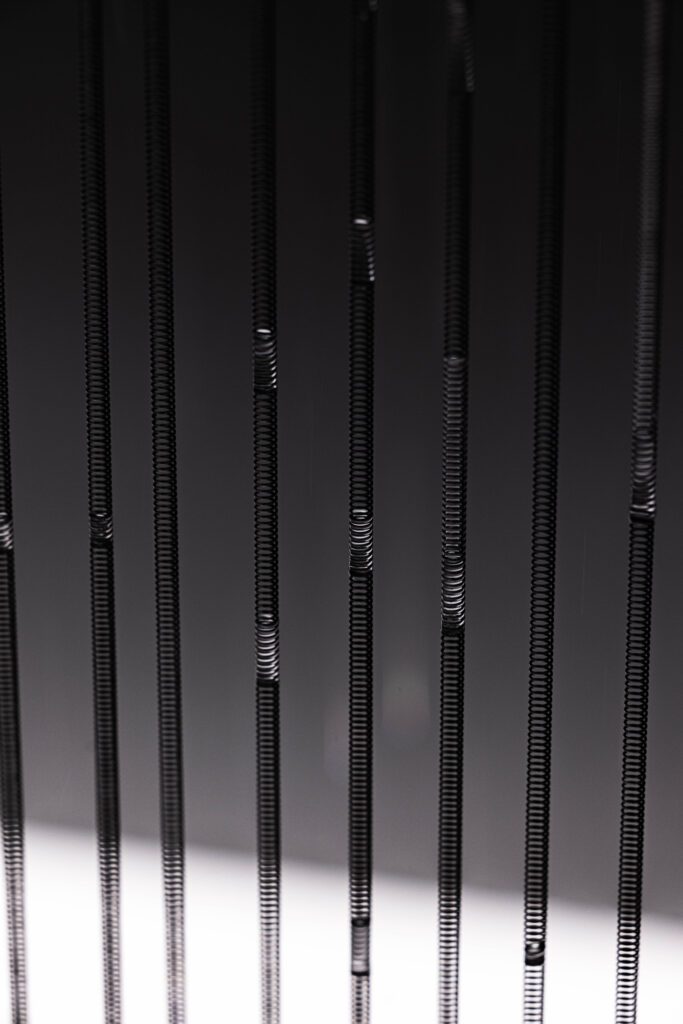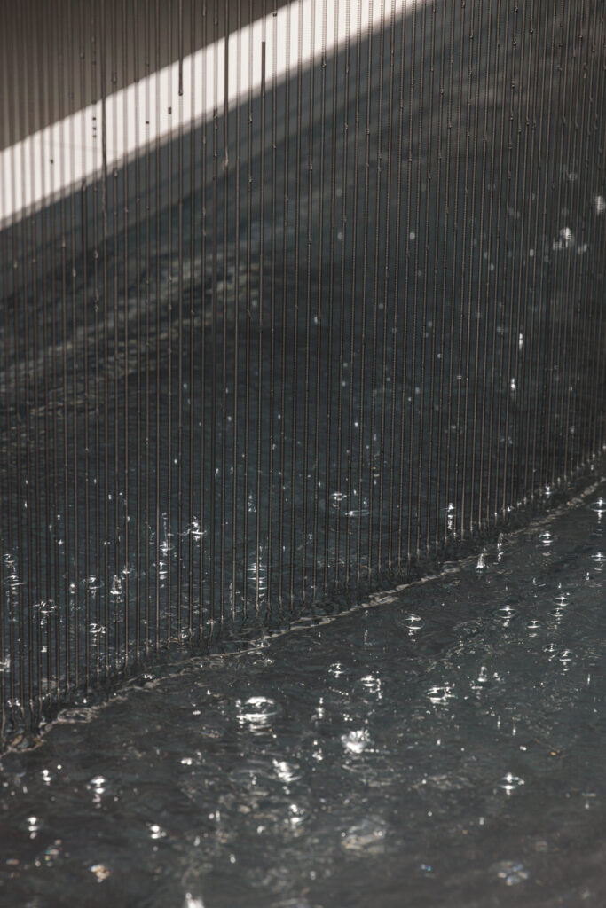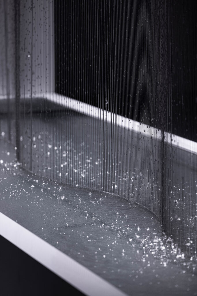 L’installazione si sviluppa come un percorso immersivo in cui centinaia di sottili molle in acciaio inossidabile guidano il movimento delle gocce d’acqua lungo traiettorie definite in una composizione dinamica, capace di rivelare la bellezza nascosta dei sistemi idrici normalmente invisibili. Il loro movimento conserva tuttavia una sottile variabilità: a volte veloce, a volte lento, si arresta, si unisce o si divide.