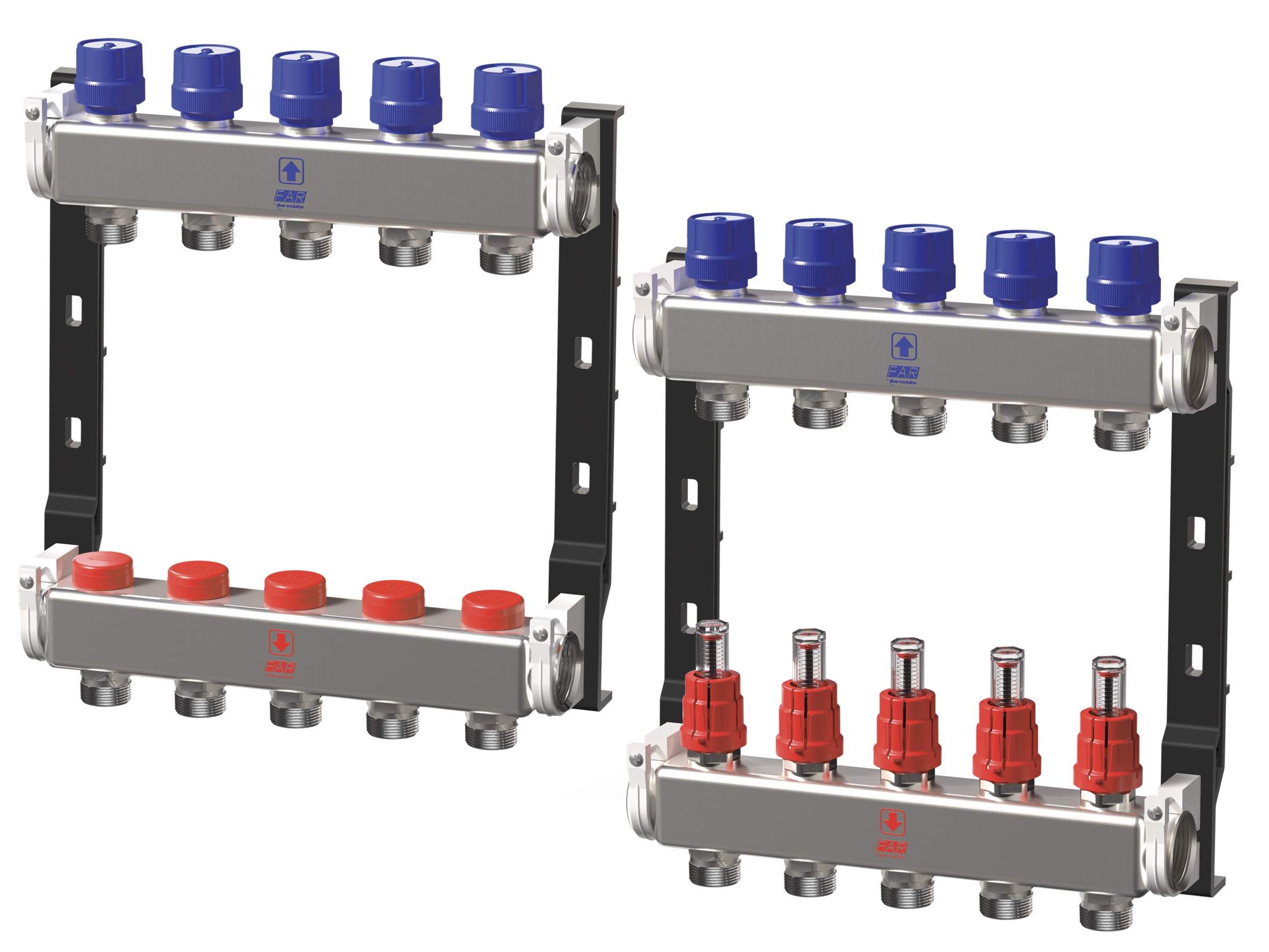 Il collettore di mandata è disponibile con detentori di bilanciamento o con flussimetri e regolatori di portata, per un controllo preciso dei circuiti. Il collettore di ritorno consente l’installazione di comandi elettrotermici per la gestione automatizzata delle derivazioni tramite termostati o centraline.
