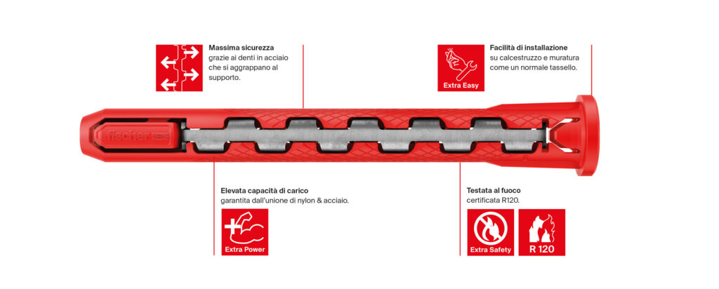È da queste premesse che nasce HybridPower, un nuovo tassello che andrà a coprire il divario che finora c’è stato sul mercato tra i fissaggi in acciaio e quelli in plastica. Spesso infatti c’è la necessità di garantire carichi elevati e sicurezza (per esempio in caso di incendio) ma i classici ancoraggi in acciaio si rivelano sovradimensionati e il loro utilizzo limitato alle sole applicazioni su calcestruzzo. Combinando i vantaggi di un classico tassello in nylon con quelli di un ancoraggio in acciaio, HybridPower può essere utilizzato sia su laterizio che su calcestruzzo, offrendo capacità di carico e un ancoraggio sicuro anche in caso di incendio».