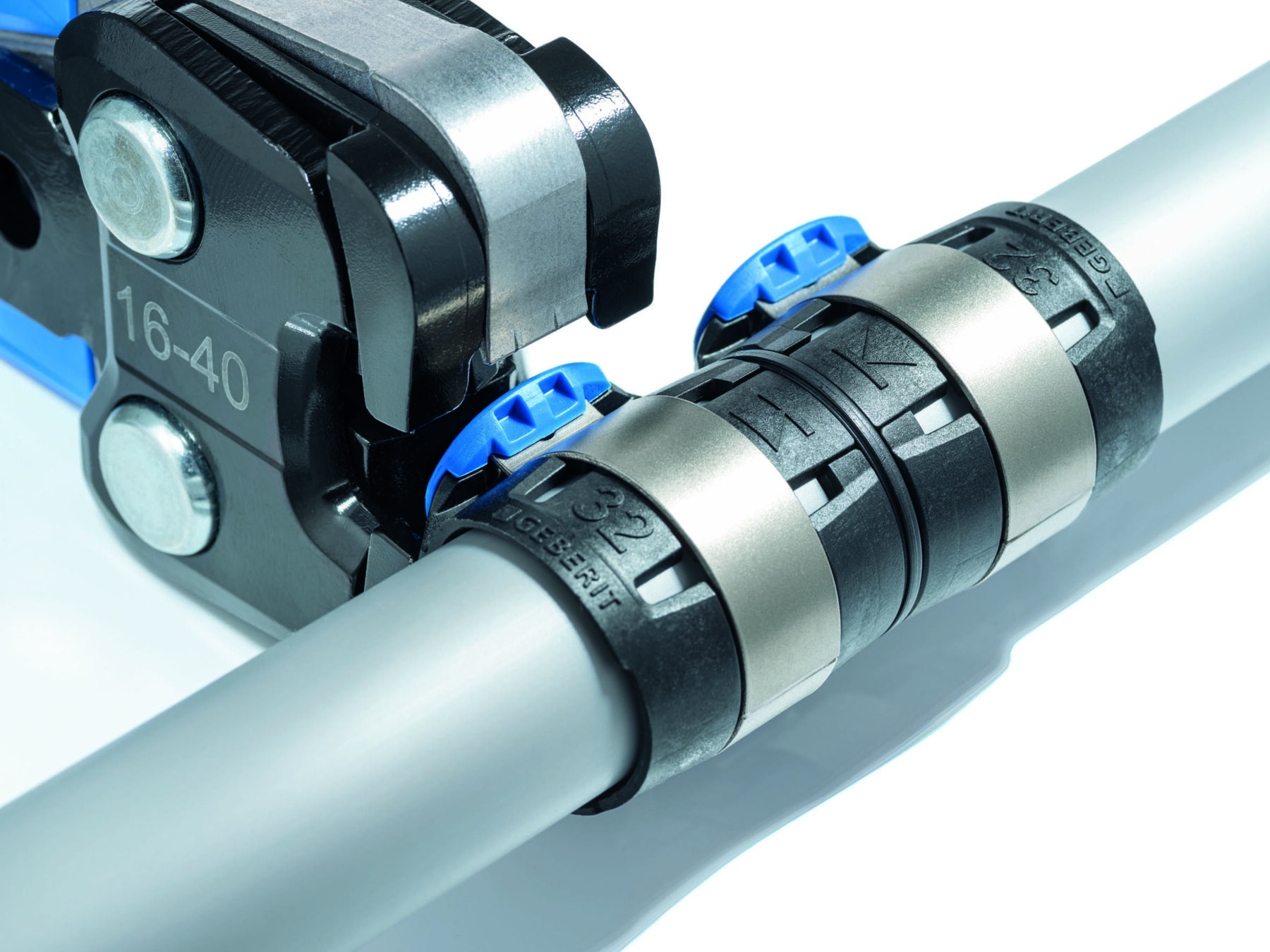 Con Geberit FlowFit il modulo di pressatura, orientabile, può essere ruotato senza problemi in qualsiasi posizione desiderata, rendendo molto più facile e confortevole l’operazione anche in spazi stretti o difficili da raggiungere. A questo punto, è sufficiente che la ganascia agganci lateralmente l’indicatore di pressatura (e non l’intero raccordo); l’anello di pressatura in acciaio inossidabile attorno al raccordo viene serrato e il sistema viene sigillato in modo permanente.