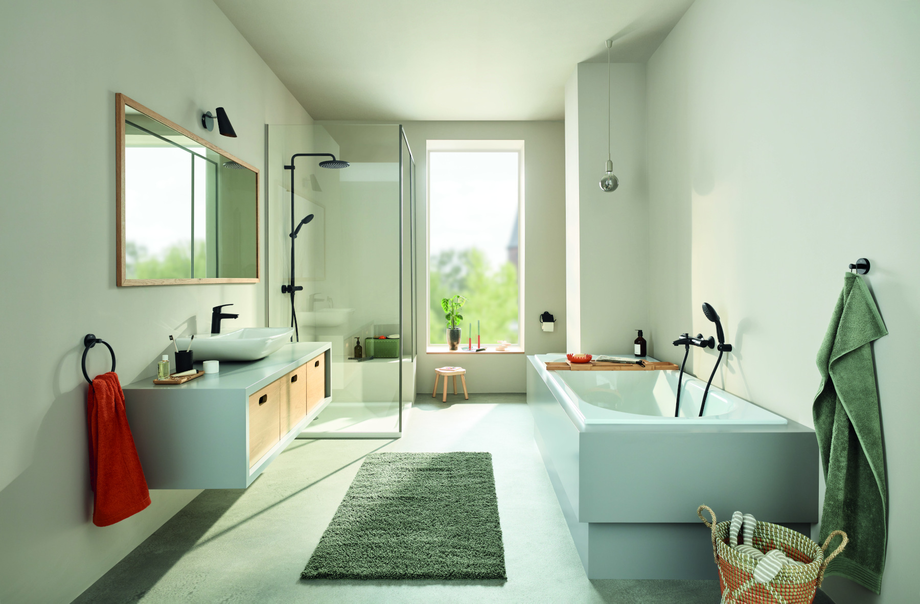 Anche in bagno Grohe Eurosmart si abbina a sistemi doccia, piastre di azionamento e accessori in nero opaco per un ambiente elegante e coordinato. Tempesta 250 è il sistema doccia con miscelatore termostatico, soffione doccia con getto ancora più ampio e manopola doccia Tempesta 110 con tecnologia Grohe SmartSwitch, che garantisce un passaggio intuitivo tra i due getti (Rain e Jet) semplicemente ruotando con la punta delle dita il tasto selettore dedicato.