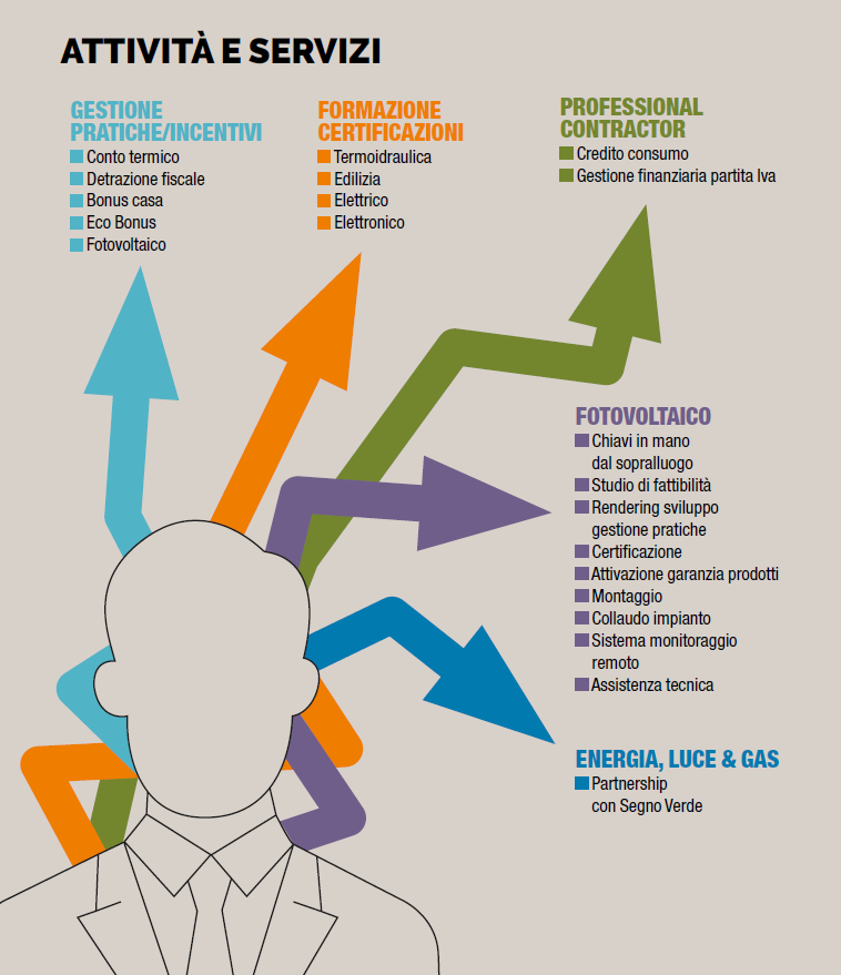 «Tutto quel che occorre per supportare i nostri partner nella gestione e nello sviluppo delle procedure per accedere agli attuali incentivi, in collaborazione industriale con i maggiori enti professionali. Quindi gestione di pratiche e incentivi, corsi di formazione dedicati agli operatori termoidraulici, elettrici, elettronici ed edili, gestione degli impianti fotovoltaici chiavi in mano, crediti al consumo sia per partite IVA sia per privati tramite le rivendite partner.