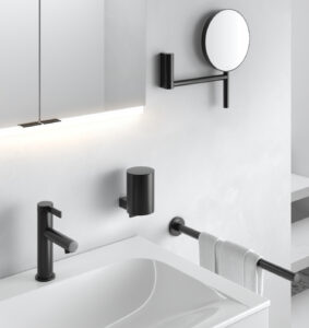 «Black Selection è il nostro arredo-bagno nero opaco, che comprende rubinetteria, accessori e specchi contenitori. Le superfici, estremamente vellutate e piacevoli al tatto, colpiscono per la loro speciale brillantezza, che dona un tono lussuoso al bagno. Inoltre, una speciale verniciatura le rende resistenti, durevoli e facili da pulire. Infine, è importante l’impronta di colore e di personalità anche negli accessori».