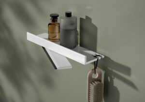 Ne è un esempio la mensola per doccia (in bianco o in nero opaco), eccezionale per design e funzionalità grazie a dettagli come il tergi-vetro invisibile integrato nel design e i due incavi laterali sulla superficie di appoggio, che servono ad appendere gli utensili da doccia».