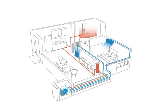 Il sistema multi-split CirQHP permette di realizzare la climatizzazione estiva e invernale con le unità interne a espansione diretta, in modo efficiente e con ridotti consumi energetici. Il recupero di calore per la produzione di ACS permette di risparmiare 2.600 kWh di energia elettrica in una stagione estiva media, considerando un’efficienza di recupero del 100%.