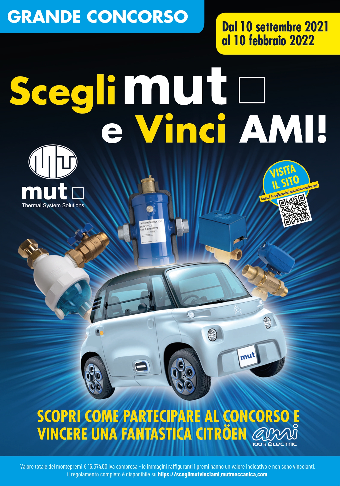 Come premio abbiamo scelto la Citroën AMI perché rappresenta efficacemente i concetti del risparmio energetico, della riduzione delle emissioni di CO2, dell’ottimizzazione dei materiali, dei componenti e del ciclo produttivo, ai quali la produzione MUT tende. Ci piace pensare che il vincitore potrà muoversi liberamente in città con questo veicolo e magari farlo utilizzare ai propri figli, essendo possibile guidarla a partire dai sedici anni. Le auto saranno consegnate ai vincitori direttamente presso la nostra sede di Montecchio Maggiore. Oggi possiamo dire che comprare un prodotto MUT non è mai stato così “elettrizzante”.
