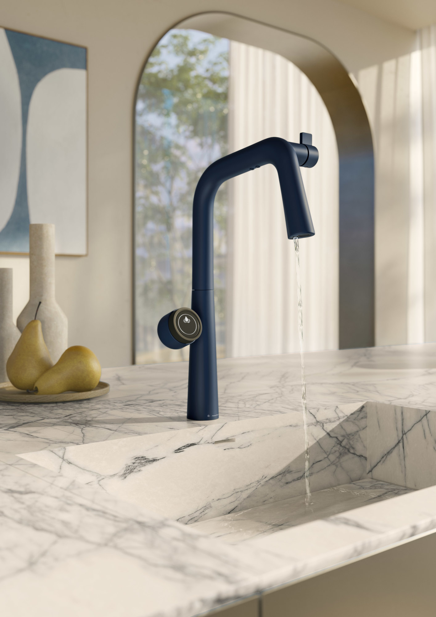 Il miscelatore multifunzionale Alkimia trasforma lo stato ordinario della rubinetteria da complemento d’arredo a “elettrodomestico”. Soprannominato l’“occhio del miscelatore” data la forma, integra un comando elettronico che apre al nuovo concept di “rubinetteria-elettrodomestico”, funzionale e moderno, ma anche iniziatore di una nuova pratica di quotidianità sostenibile.