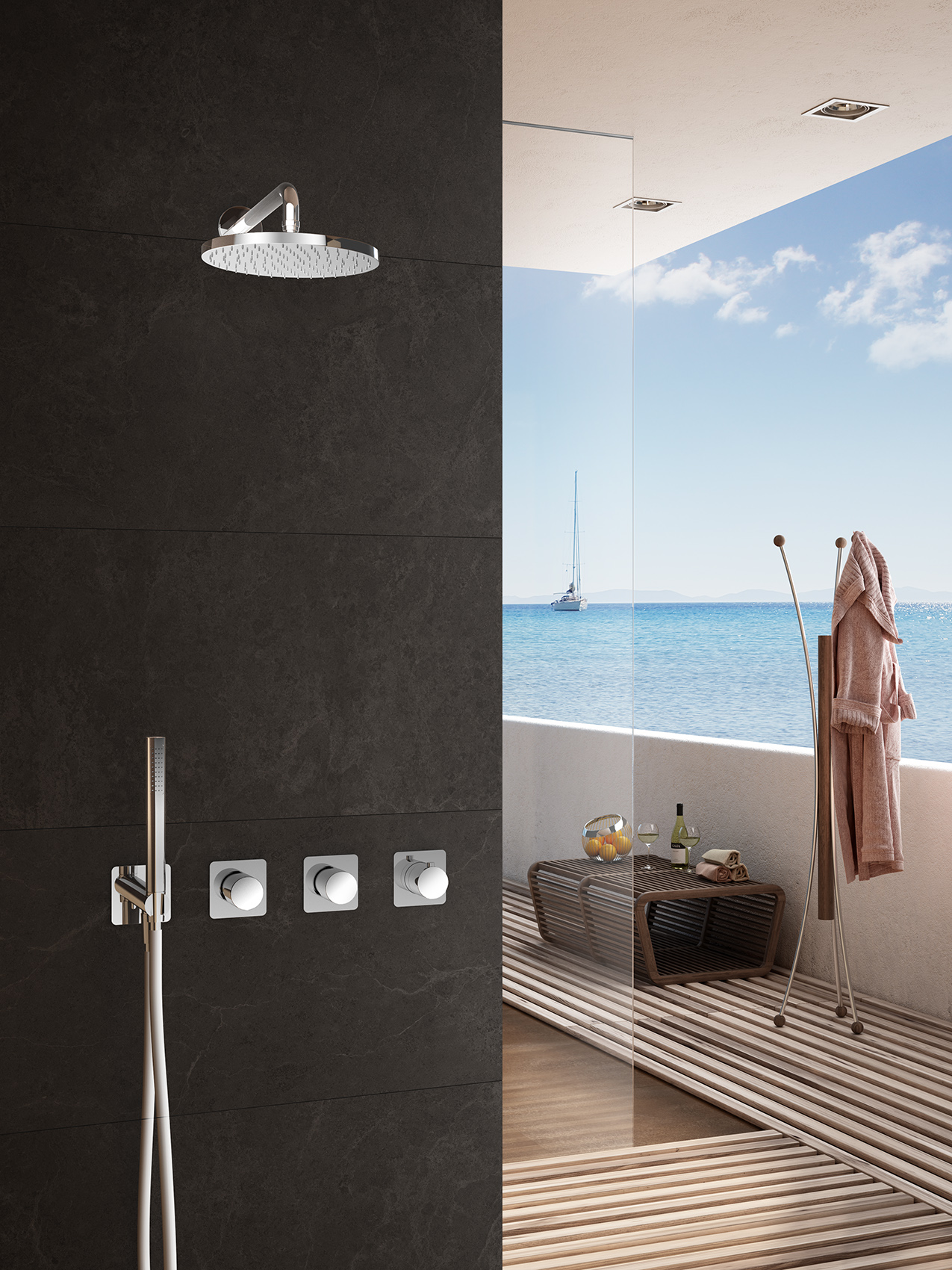 I singoli elementi possono essere disposti in fase d’installazione secondo le esigenze o le preferenze del cliente, in base all’effetto estetico che si vuole ottenere per valorizzare al meglio il proprio ambiente bagno. Miscelatore termostatico, rubinetto di chiusura, collettore e deviatore sono contenuti nella scatola di fissaggio in plastica per assicurare semplicità d’installazione e garanzia di tenuta e isolamento.
