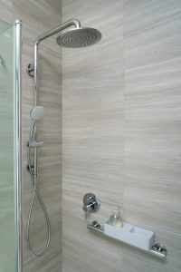 doccia in uno spazio sicuro, utilizzando aste e colonne come maniglie di sicurezza