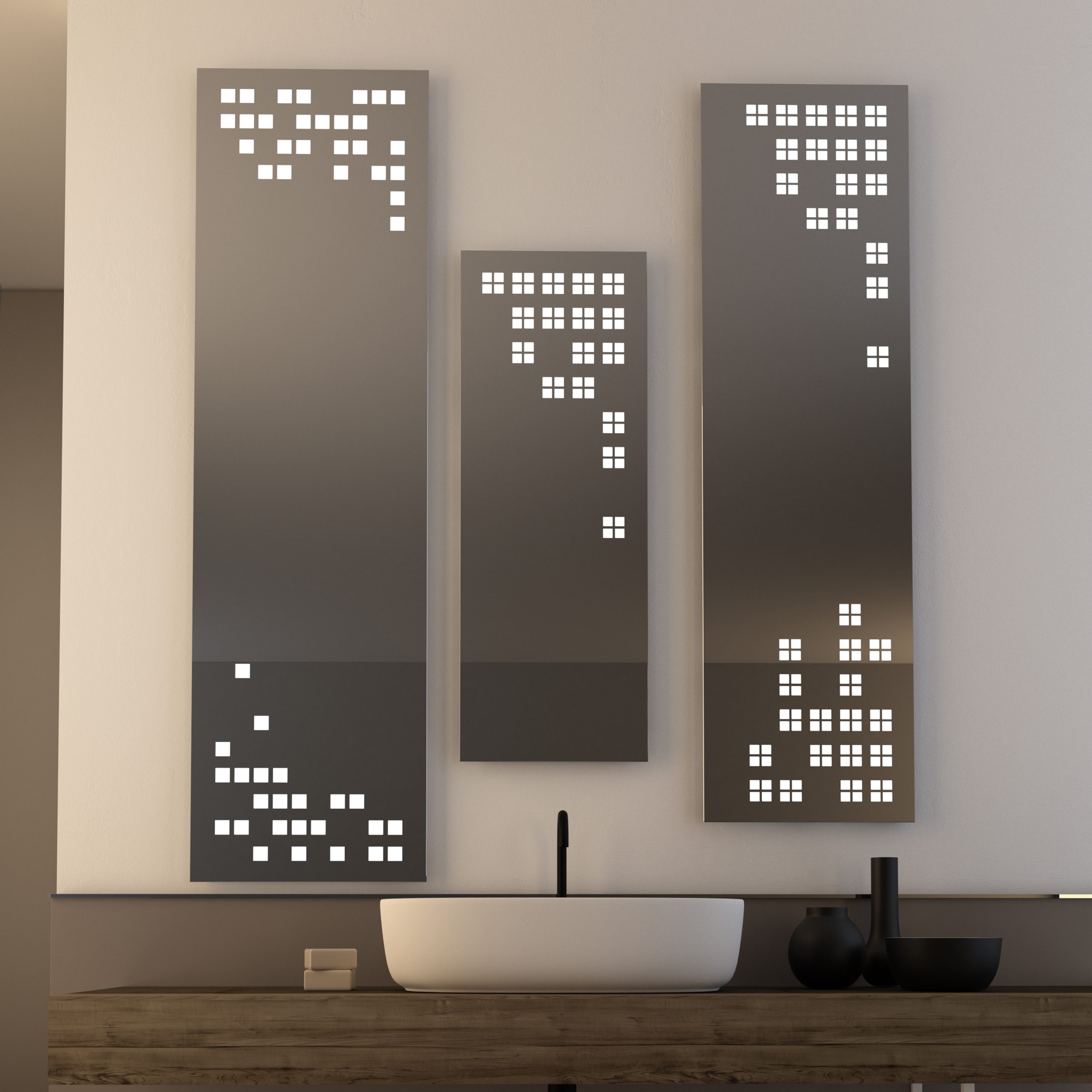 La serie Skyline, disegnata da Bruna Rapisarda, offre specchi rettangolari versatili, che possono essere accostati in verticale e/o orizzontale evocando l’immagine di un grattacielo moderno