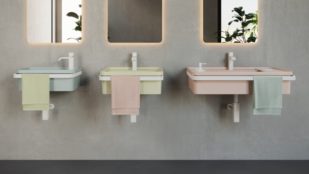 La linea di mobiletti con lavabo in ceramica Pilò, disegnata da Paolo D’Arrigo, è personalizzabile con colori della gamma Nuance ed Essence