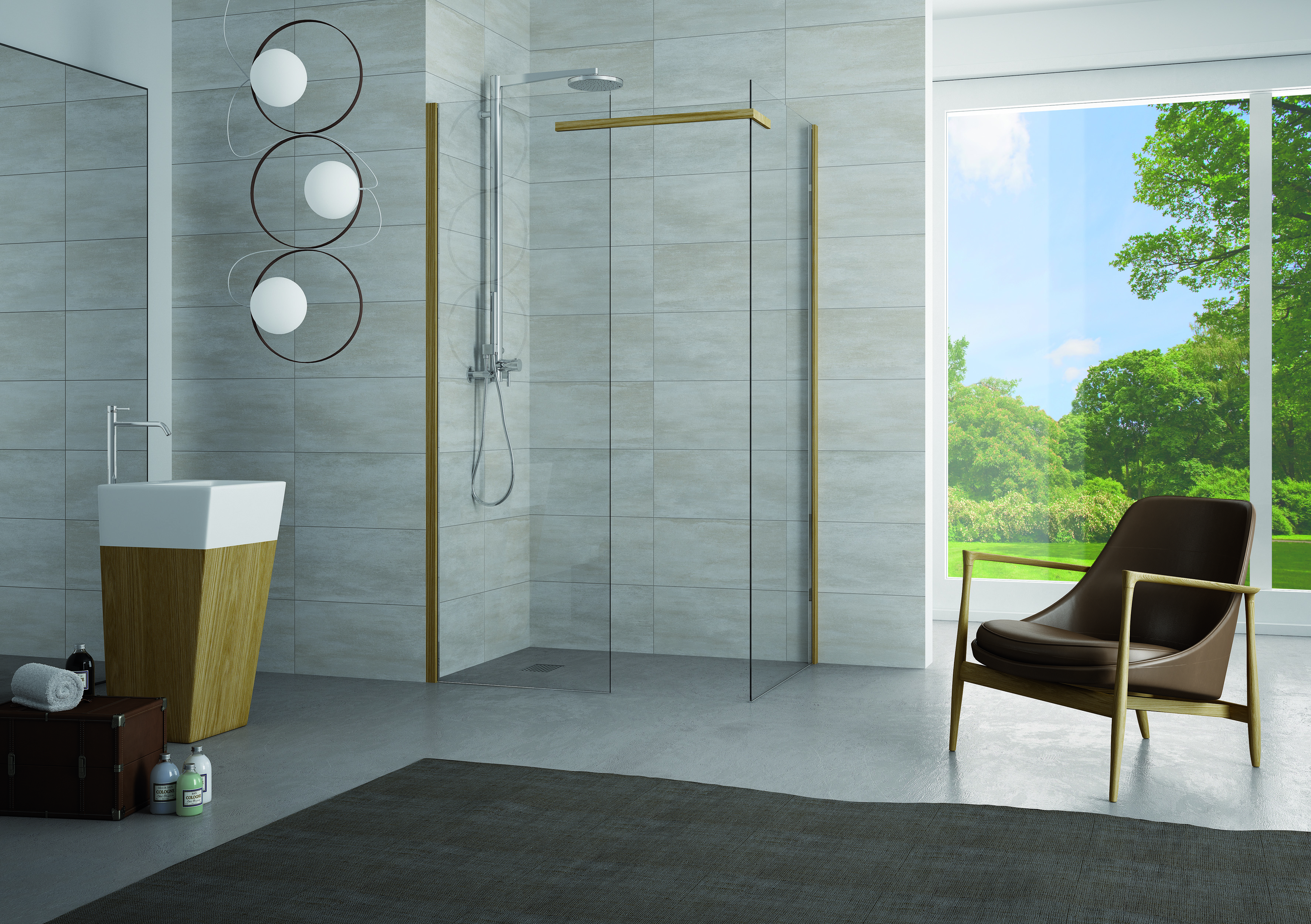 In questa soluzione doccia, quindi, gli inesplorati abbinamenti materici contaminano stilisticamente le lastre di vetro: non solo i profili ma anche gli elementi orizzontali di sostegno si spingono oltre la loro semplice funzione strutturale fino ad abbracciare tutti i vetri, divenendo vero e proprio elemento caratterizzante di questo mobile doccia.