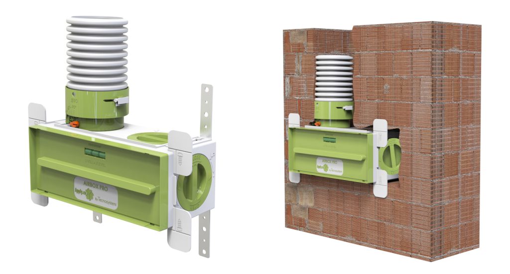 Il tubo dedicato alla VMC può essere collegato in posizione posteriore, superiore o laterale per la massima flessibilità di installazione. Airbox Pro è fornito completo di serrande di regolazione e di un’ampia gamma di accessori per un’installazione rapida e semplice.