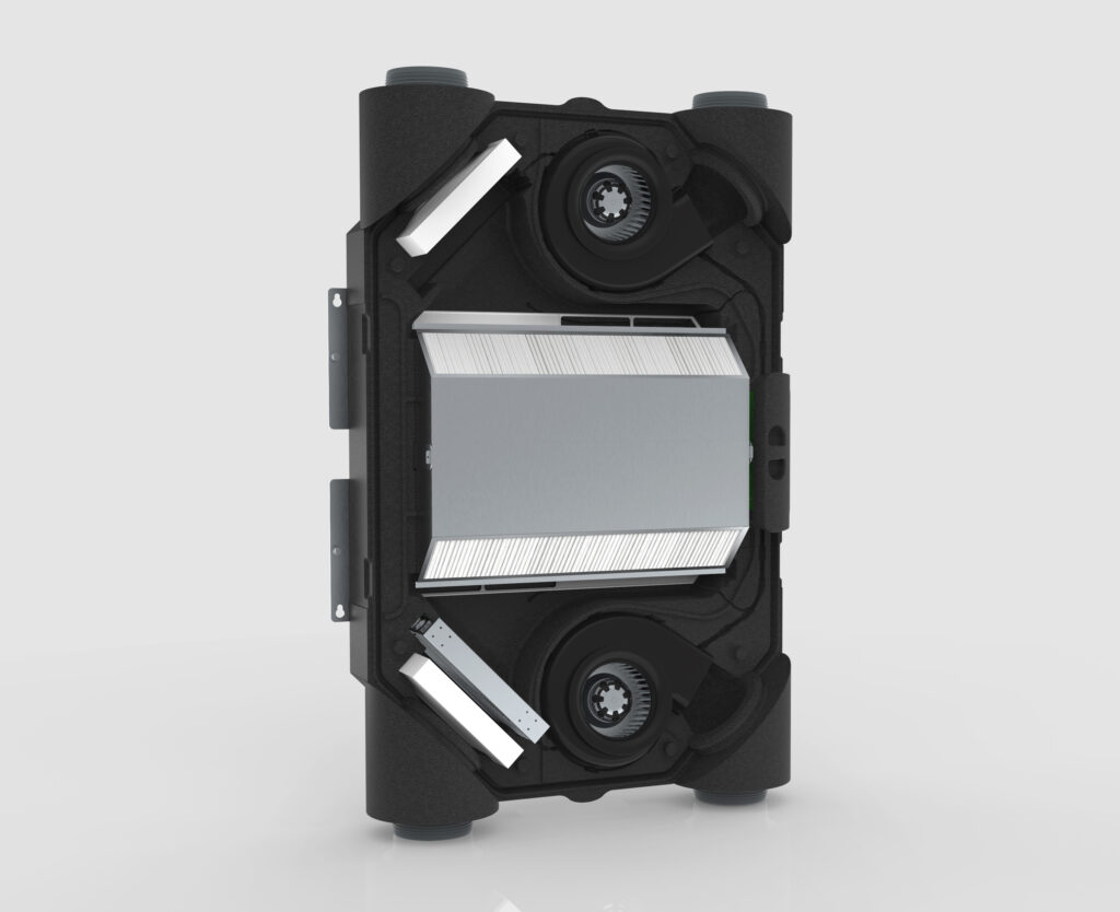 Dal punto di vista installativo, gli ingombri sono ridotti (la macchina è alta soltanto 21 cm), per facilitarne l’alloggiamento in posizione orizzontale e verticale, e le quattro connessioni possono essere ruotate e orientate in maniera indipendente. Ariosa HV dispone di due ventilatori elettronici a portata costante e i filtri sono controllati elettronicamente, per informare puntualmente l’utente su quando è necessario procedere con le operazioni di pulizia.