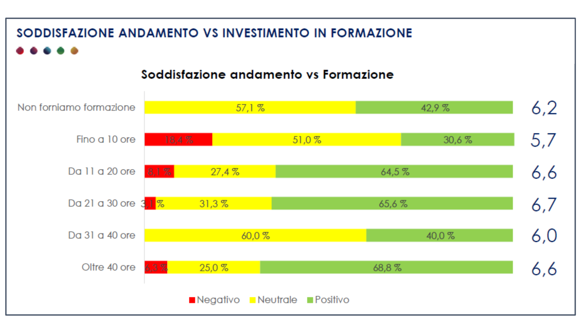 Il 92% delle aziende dichiara di puntare su questo aspetto. Il 27% sostiene, in particolare, di aver investito in formazione “fino a 10 ore”, il 35% “da 11 a 20 ore”, il 18% “da 21 a 30 ore”, il 3% “da 31 a 40 ore” e il 9% “oltre le 40 ore. Fa riflettere, in questo senso, come siano decisamente più soddisfatti delle performance aziendali gli imprenditori che dedicano un numero di ore maggiore alla formazione dei propri dipendenti (ad esempio, il 69% di chi investe oltre 40 ore lavorative è felice dell’andamento economico della propria azienda, contro il 31% di chi investe fino a 10 ore).