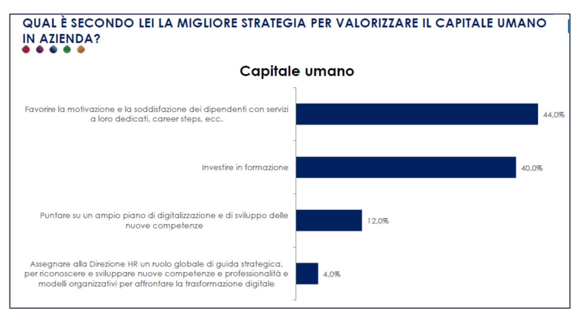 Il 44% delle aziende ritiene essenziali i servizi dedicati al personale (career steps, ecc.), mentre per il 40% la strategia vincente è investire in formazione.