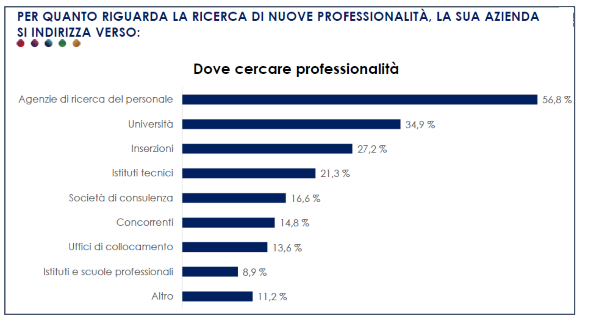 Le nuove sfide del mercato richiedono, infatti, nuove professionalità. Per trovarle le aziende si indirizzano verso agenzie di ricerca del personale (57%), università (35%), inserzioni (27%), Istituti tecnici (21%), società di consulenza (17%), concorrenti (15%), uffici di collocamento (14%), istituti e scuole professionali (9%).