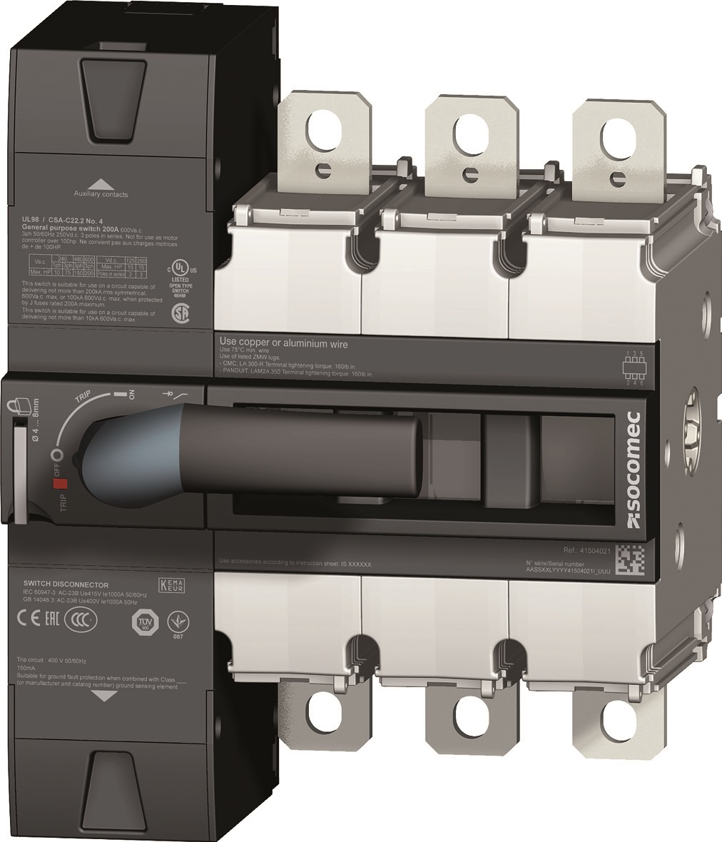 Per completare la gamma di interruttori di manovra-sezionatori Sirco, Socomec di Isola Vicentina (VI) propone i nuovi Inosys LBS con apertura visibile e bobina di sgancio, da 100 a 1.250 A e fino a 1.500 Vc.c., per applicazioni c.a. e c.c., che offrono una protezione completa e affidabile a ogni tipo di impianto elettrico.