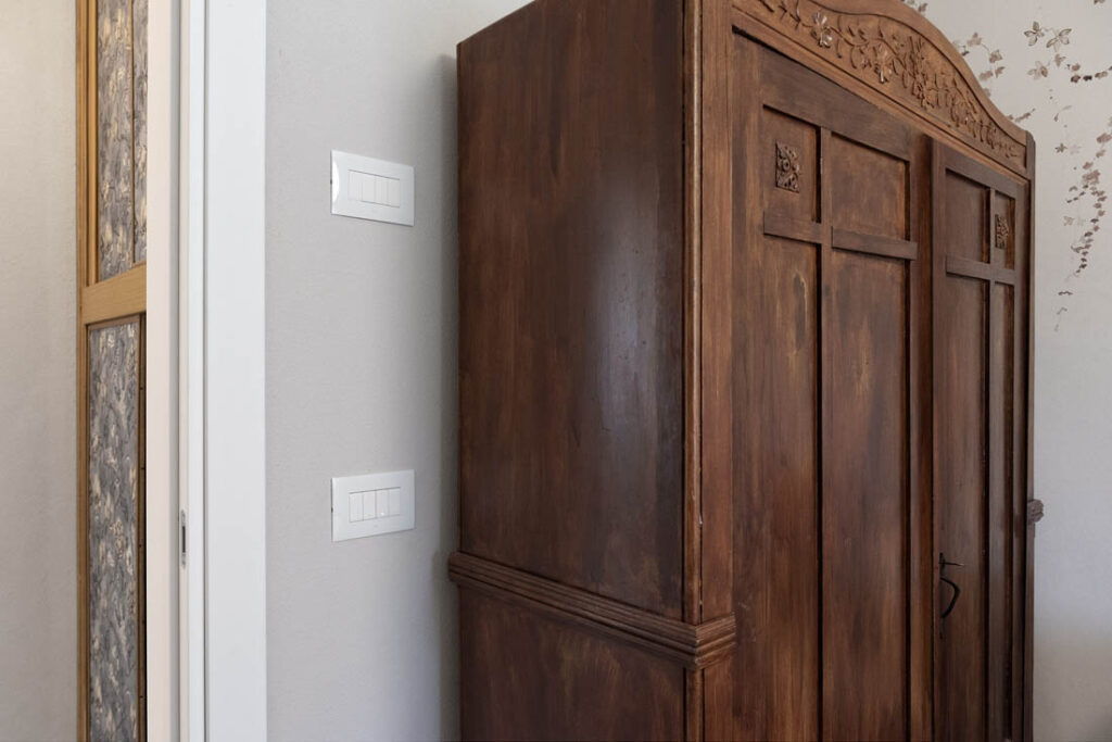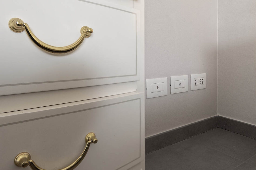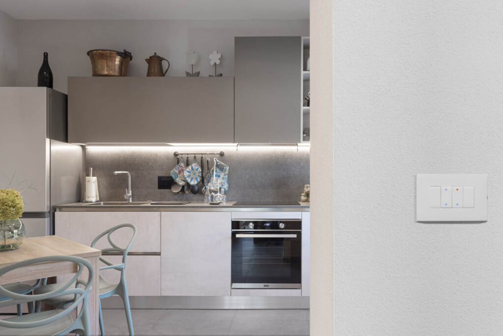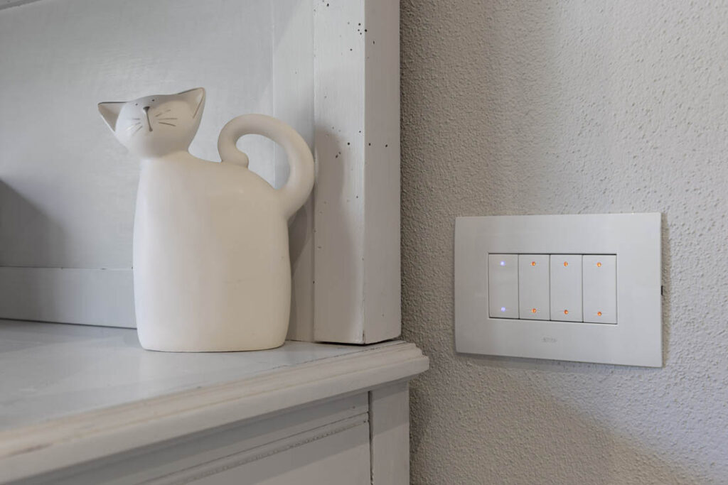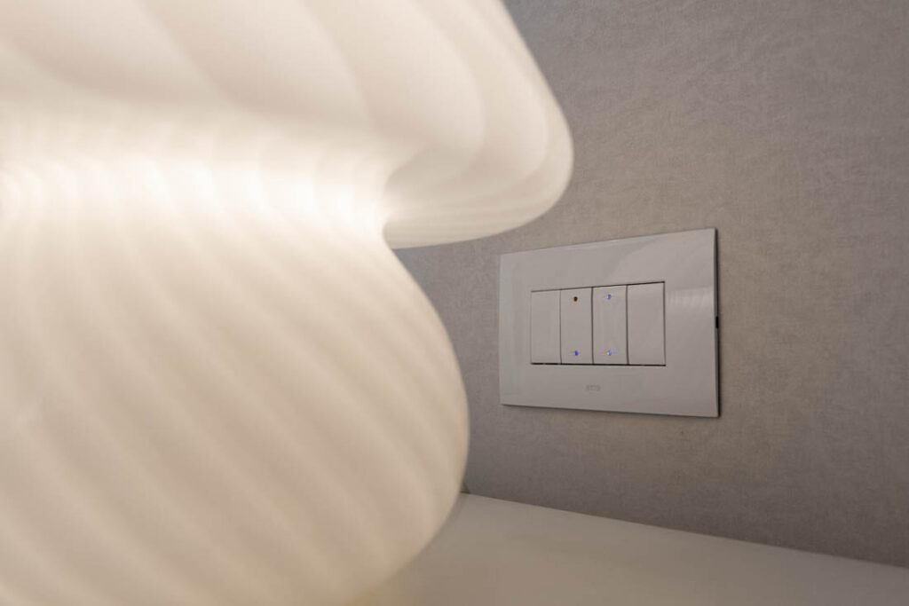 Il cuore pulsante dell’abitazione è rappresentato dal sistema domotico filare Avebus. Questa architettura permette una gestione integrata di tutte le funzioni e automazioni della casa, garantendo affidabilità e flessibilità nel tempo. Per i punti luce è stata selezionata la serie civile Domus 100, caratterizzata dalla pregiata finitura in bianco lucido. La tonalità dei tasti si sposa armoniosamente con le placche ultrasottili Smart 44, realizzate in metallo e declinate nella medesima colorazione per un effetto “tono su tono”.