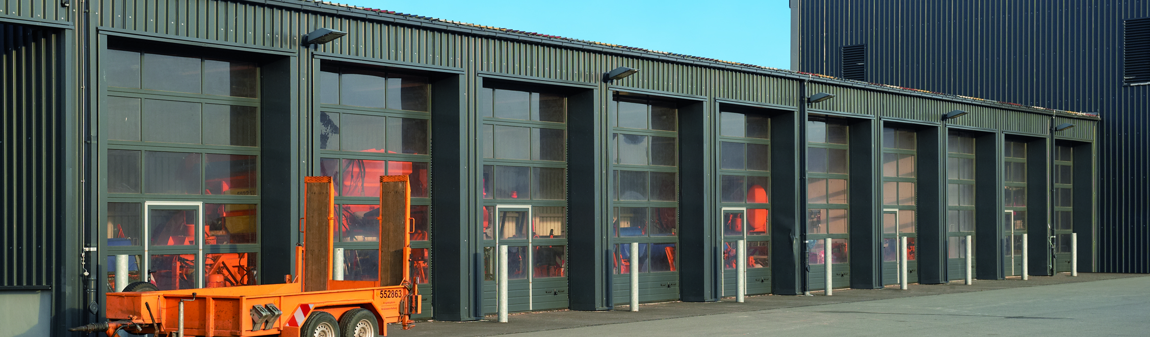 Grazie ai profili per finestratura a taglio termico (si tratta di profili a tre camere, in cui il profilo esterno ed interno sono separati da una precamera con rinforzo in materiale sintetico) e agli elementi in acciaio, questa chiusura garantisce una coibentazione termica con un valore U fino a 1,5 W/ (m²•K) per un portone con dimensioni di 5×5 metri.