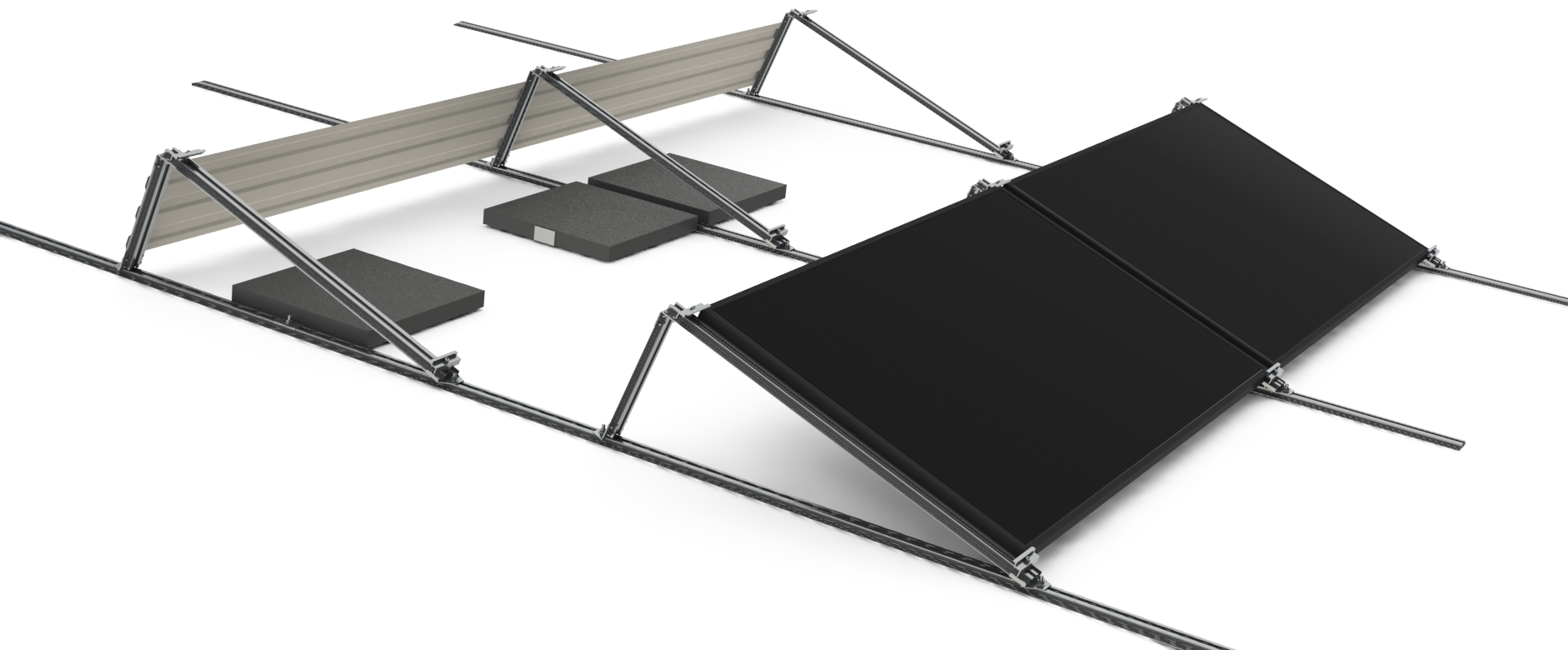 La Base BISOL EasyMount ALU riprogettata è supportata da un profilo più ampio che riduce la pressione sulla superficie del tetto e permette alla struttura di auto-sorreggersi. La stabilizzazione supplementare può essere ottenuta posizionando zavorre e frangivento. Lo spazio tra le file può essere facilmente regolato in base a posizione geografica, preferenze specifiche del cliente o rendimenti energetici richiesti.