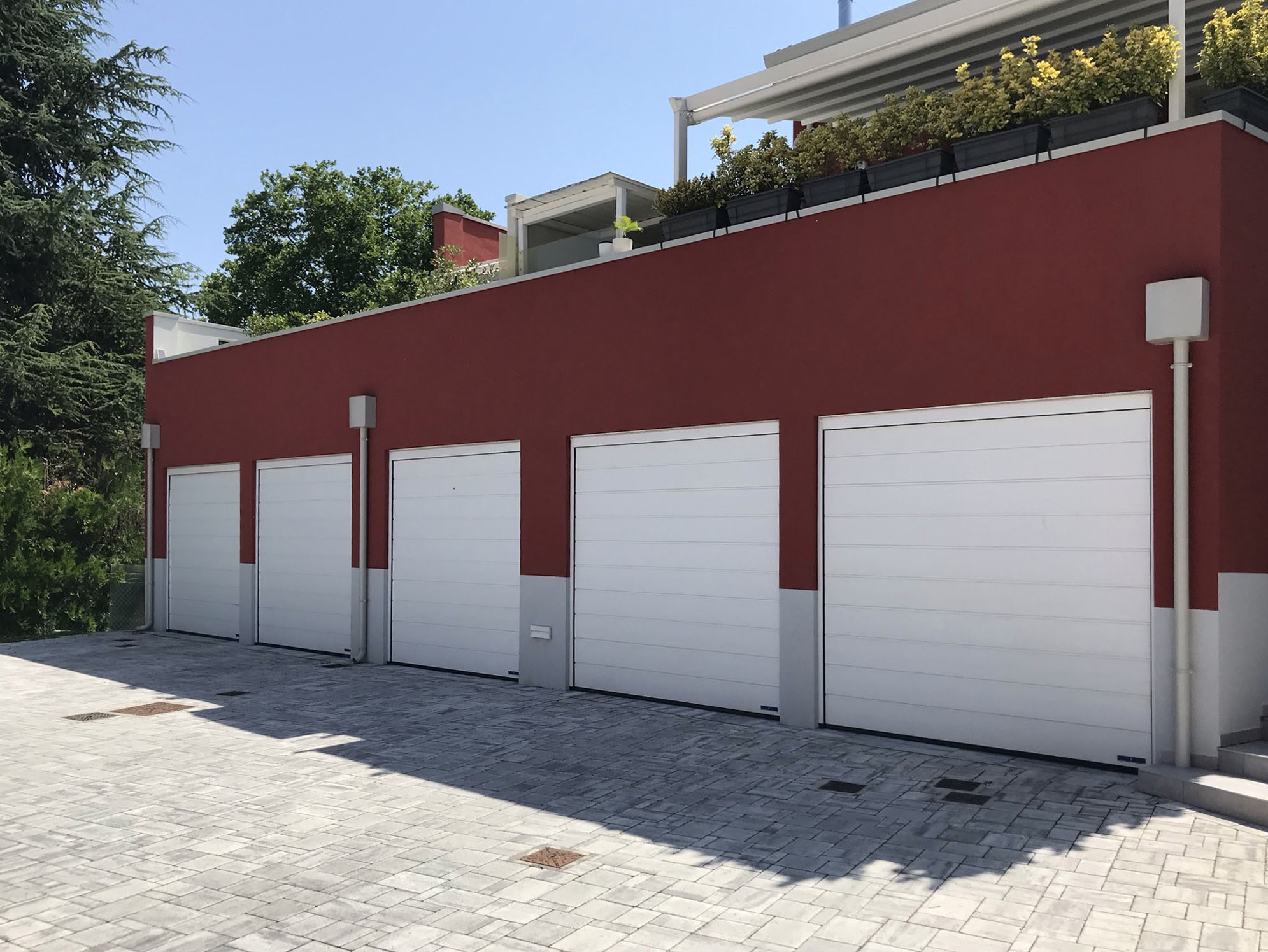 A chiusura dei garages sono stati invece installati 5 portoni sezionali LPU 42 (dimensioni: larghezza da 2.220 a 2.370, altezza 2.375 mm), composti da elementi modulari (spessore 42 mm) realizzati con doppia parete metallica riempita da schiuma poliuretanica. L’ottimale stabilità in tutte le posizioni, la perfetta tenuta perimetrale, l’elevato grado di isolamento termico e lo scorrimento silenzioso caratterizzano questi portoni sezionali, concepiti per adattarsi a tutte le situazioni.