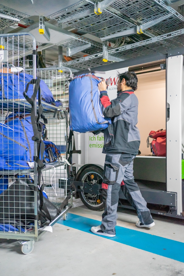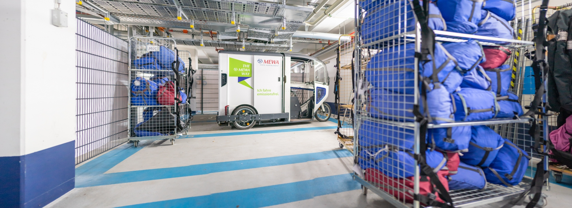 Dall’estate 2021, nel centro di Berlino le biciclette da carico elettriche del fornitore ONOMOTION vengono quindi utilizzate per coprire l’ultimo tratto del percorso. Invece di arrivare direttamente dal cliente, il camion di MEWA ora porta gli indumenti dalla sede MEWA più vicina di Groß Kienitz a un deposito intermedio centrale – situato in un hub urbano del fornitore di parcheggi APCOA – direttamente sotto il ’Mall of Berlin’. Da lì, le bici da carico elettriche e i minivan proseguono il loro percorso. Una Cargobike è in grado di trasportare circa un quarto del carico di un camion convenzionale di 3,5 tonnellate.