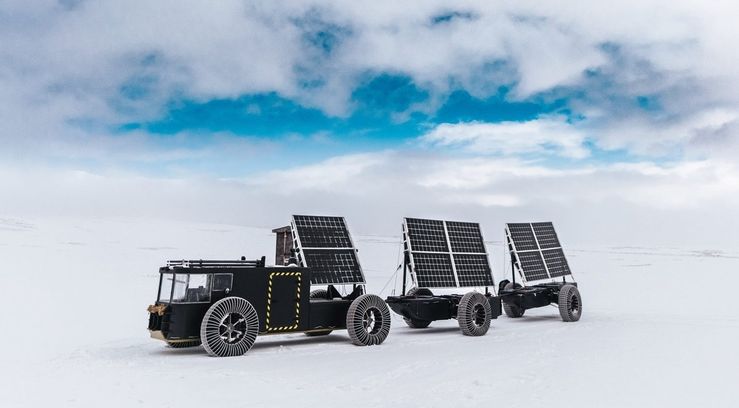 La coppia ha raccolto circa 200 kg di PET che, col supporto di un partner industriale, sono stati trasformati in filamento per 40 stampanti 3D, dalle quali sono stati ottenuti 4.000 pezzi di forma esagonale. Questi sono stati a loro volta assemblati per creare la scocca di un veicolo lungo 16 metri, il Solar Voyager, completamente green e in grado di sfidare le avversità polari. Il suo motore è alimentato da 10 moduli fotovoltaici bifacciali da 99×175 cm, potenti 325 Wp, pesanti 25 kg ciascuno; in caso di necessità, intervengono 2 batterie da 60 kg, dal potenziale di 24 V e una potenza combinata di 10 kWh. Il peso del mezzo è distribuito su speciali ruote dotate di pneumatici morbidi che favoriscono il galleggiamento sul ghiaccio, disciolto a sua volta da 6 tubi del vuoto.