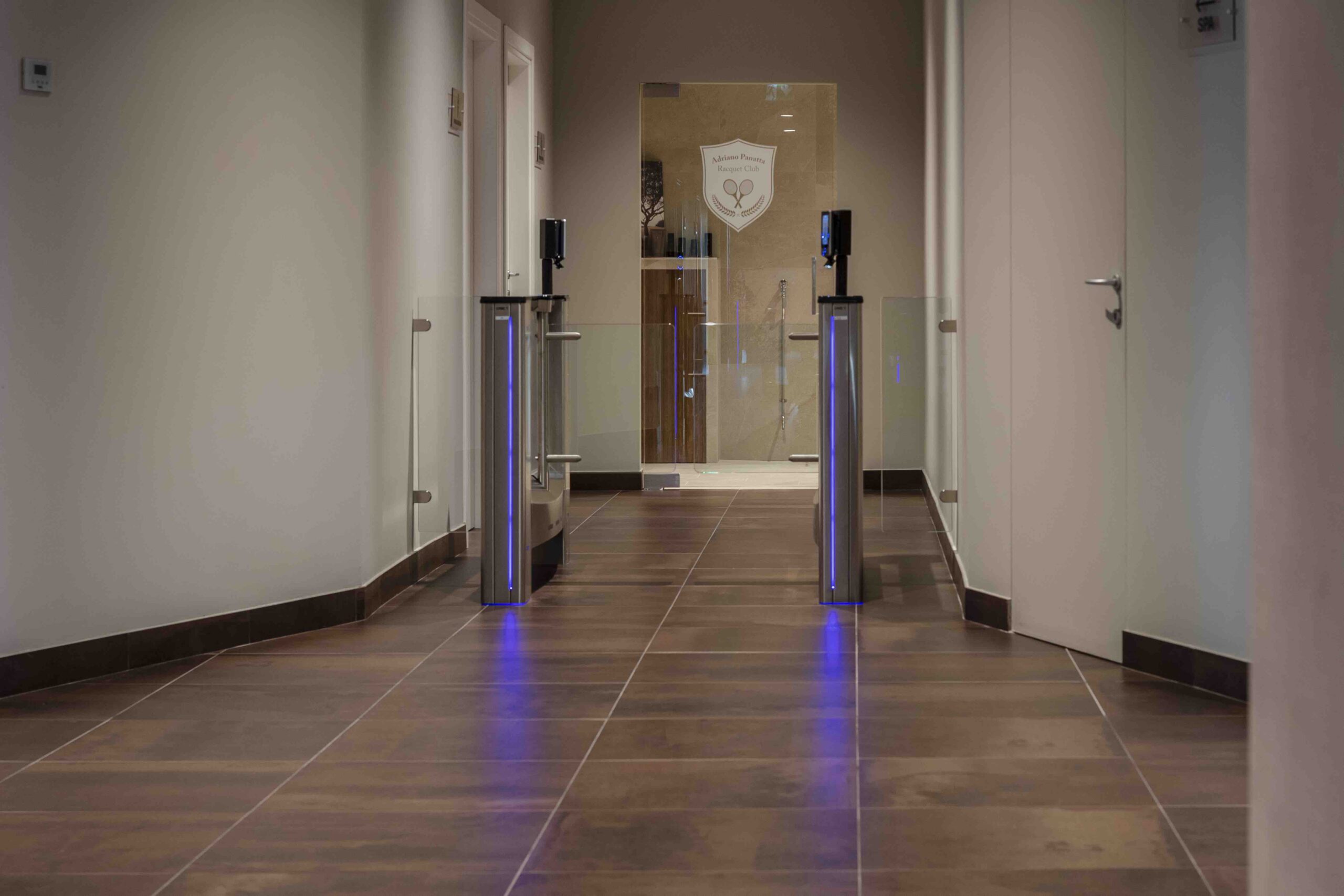 Per l’accesso principale alle aree interne dedicate ai campi da tennis, alla palestra e al centro benessere, l’azienda ha adottato tre speed gates PG03 in acciaio inox con due ante a battente che garantiscono un ingresso veloce, sicuro e controllato per il massimo comfort degli ospiti e la praticità degli operatori. Inoltre, è stato installato anche un altro varco pedonale veloce GLA1 ad anta battente in grado di attivare la funzione di evacuazione rapida in caso di emergenza e per il transito provvisorio dei carrelli di servizio. Grazie alle loro dimensioni, entrambi i modelli sono pensati anche per il passaggio di utenti con disabilità. Per rimanere in linea con lo stile d’arredo del centro le ante e i top di finitura di tutti i varchi sono stati elegantemente rifiniti con vetro temperato di colore nero, donando trasparenza e luminosità.