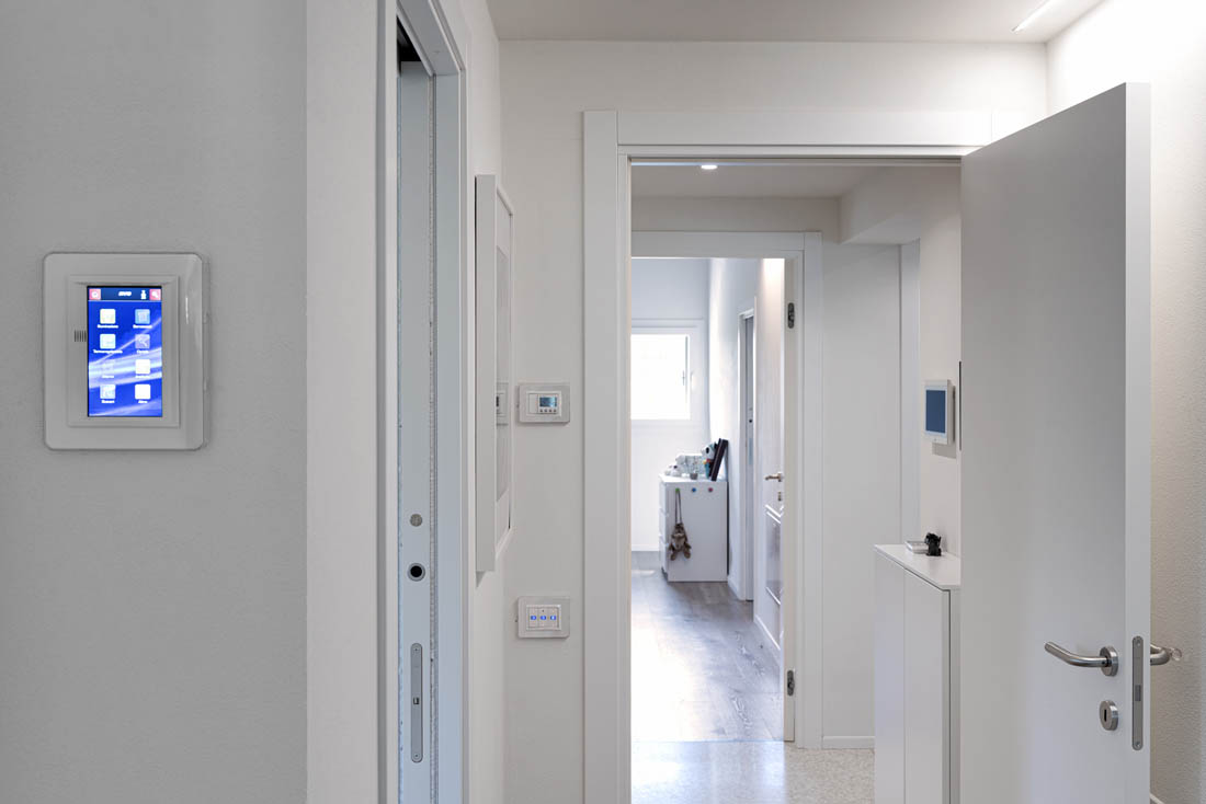 L’impianto è ulteriormente impreziosito da centrali antifurto con tastiera touch screen e da eleganti soluzioni di comando che donano maggior visibilità all’impianto. Fra queste ultime risaltano i dispositivi Multi-Touch, che rendono disponibili fino a 6 comandi per ciascun punto luce, avvalorando il contatto con la smart home grazie all’immediatezza del controllo touch e all’eleganza delle loro superfici in cristallo bianco lucido. Una soluzione all’avanguardia che corona un progetto di alto valore tecnologico.
