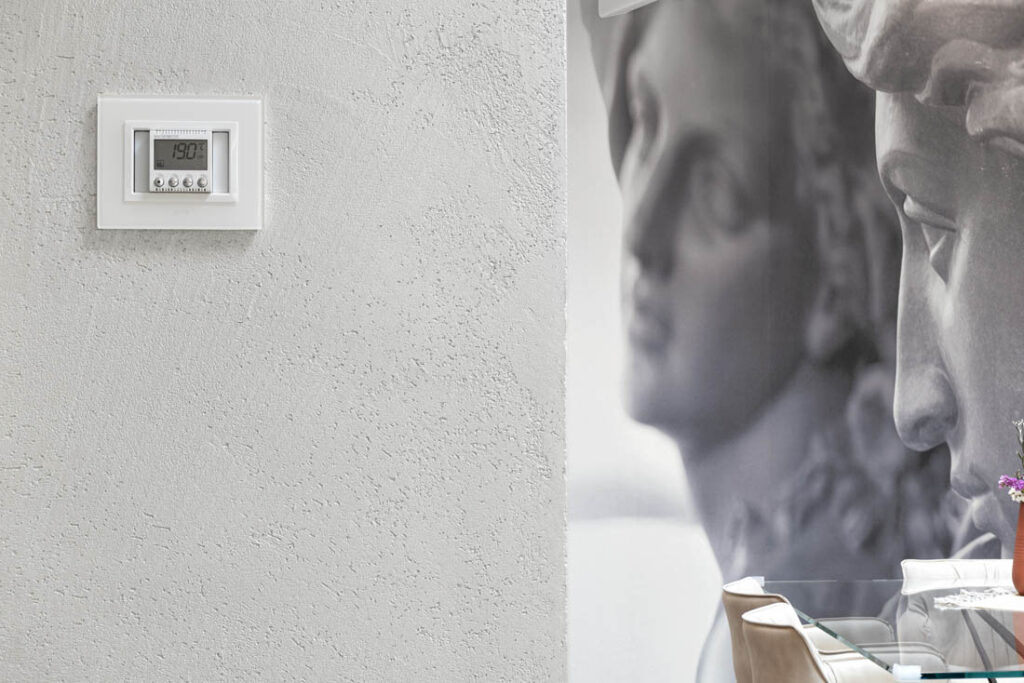 Illuminazione, temperatura, gestione dell’energia sono solo alcune delle funzionalità domotiche implementate in questo impianto; facilmente governabili dai comandi inseriti nei vari punti luce dell’abitazione, dal supervisore touch screen oppure attraverso l’app Ave Cloud. Attraverso la funzione scenari è possibile richiamare diverse impostazioni di comfort con unico comando. In più, grazie all’integrazione con il sistema di diffusione sonora, qui avvalorato dai diffusori da incasso AVE, anche la musica diventa smart.