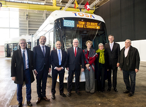 Nella foto: Christian Brunier (CEO SIG), Benoît Revaz (Director of the Swiss Federal Office for Energy), Denis Berdoz (CEO TPG), Luc Barthassat (Geneva’s state Transport Councillor), Anne Hornung-Soukup (President TPG), Michèle Künzler (former Geneva’s state Transport Councillor), Thierry Lassus (Managing Director ABB Secheron) e Michel Balestra (President SIG) il 5 Dicembre 2017 a Ginevra.