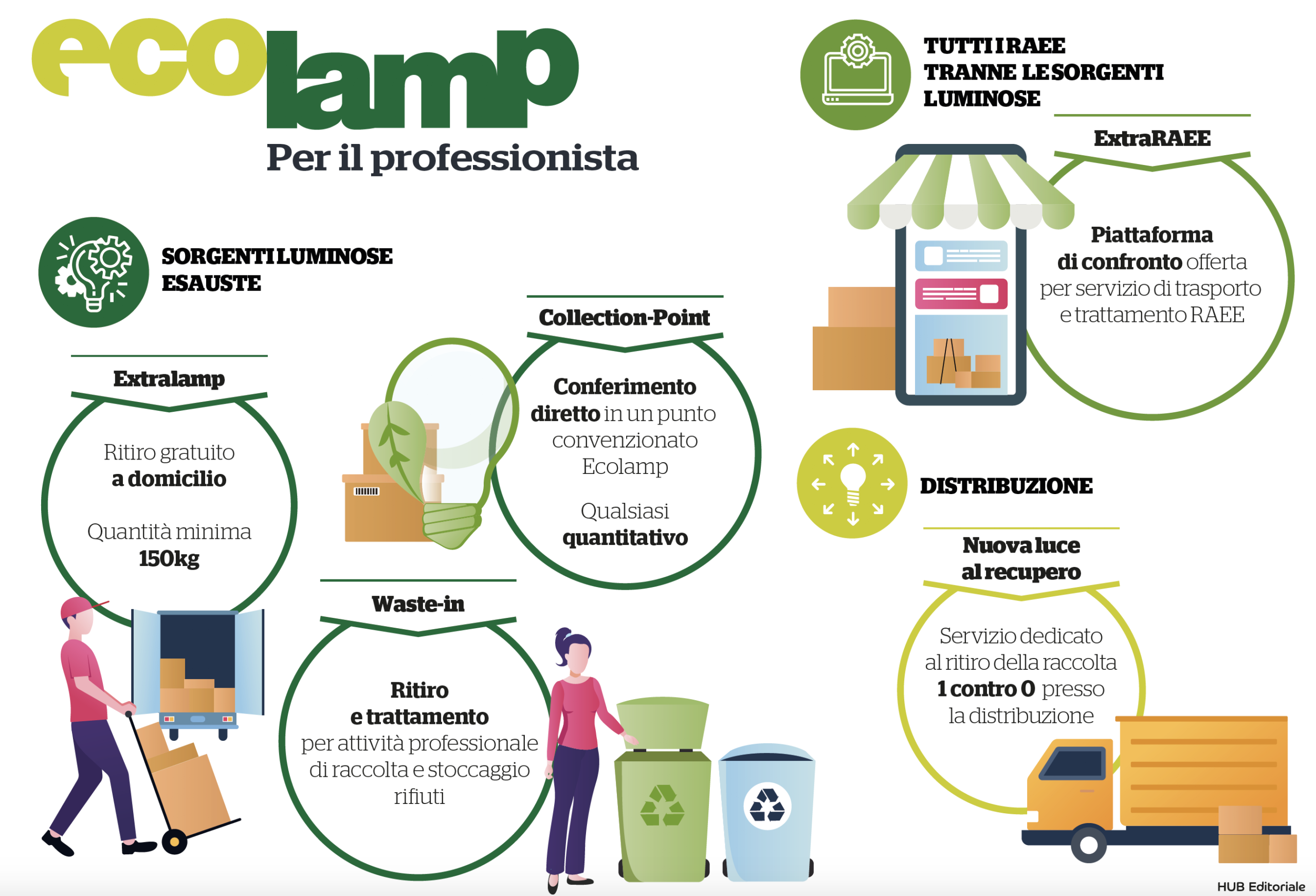 Extralamp: è un servizio gratuito rivolto a installatori e a distributori con almeno 150 kg di sorgenti luminose esauste (lampadine e tubi neon). Prevede il ritiro diretto presso il magazzino e il successivo trattamento in impianti specializzati e accreditati al Centro di Coordinamento RAEE. Per imballare correttamente le sorgenti luminose da smaltire, è possibile richiedere gratuitamente anche gli appositi cartoni, contestualmente alla richiesta di ritiro.