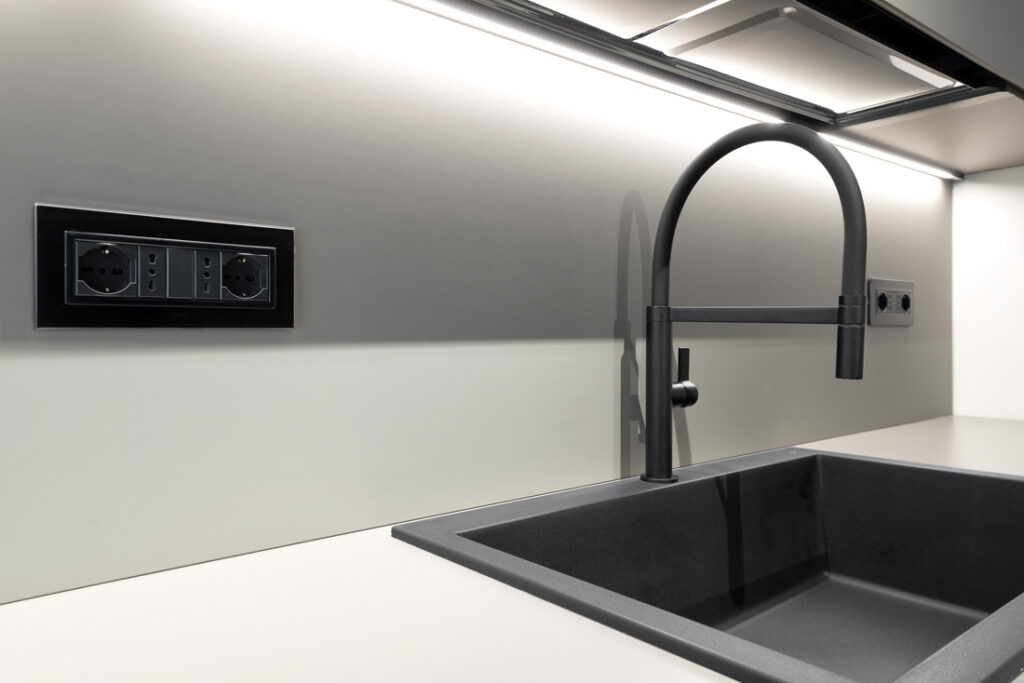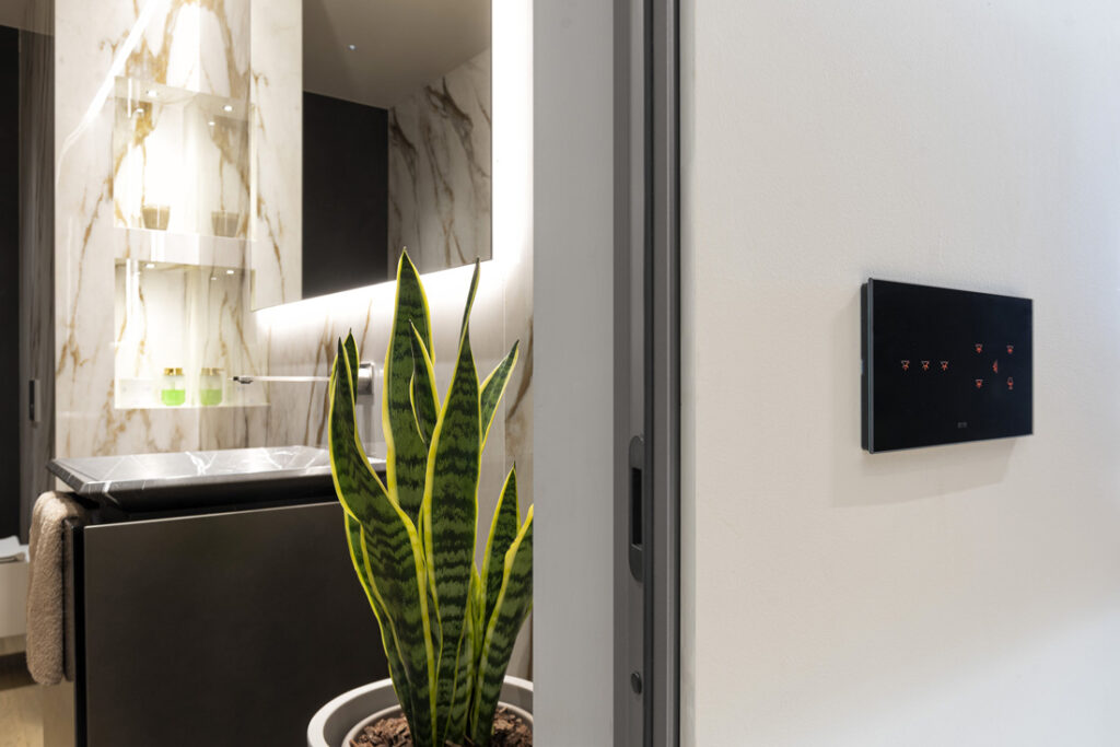 L’impianto elettrico dell’appartamento si completa con placche in vetro dal design esclusivo. Esse valorizzano la tecnologia di comando touch, celata sotto la loro superficie, attraverso simboli personalizzati, retroilluminati per essere facilmente individuabili anche al buio, mentre per le prese elettriche, sono state scelte placche in vetro finestrate che garantiscono un perfetto coordinamento estetico.