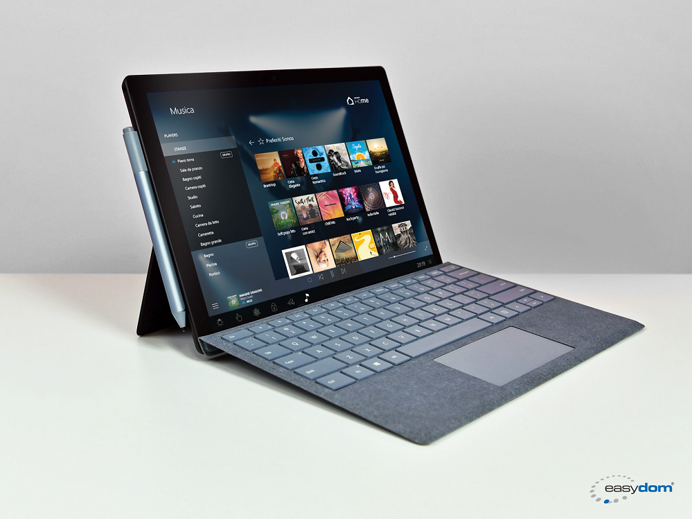 • Avere un Player musicale in ogni stanza di casa Grazie al nuovo Player musicale integrato Easydom HoMe diventa un vero e proprio strumento per la gestione della musica, permettendo di selezionare la musica da Spotify o da un percorso di rete e metterla in play da ogni punto della casa in cui ci si trovi. Si possono così creare anche scenari multimediali selezionando il mood desiderato o l’artista preferito. E mentre sta suonando la musica il touchscreen Easydom Glass3 si trasforma in un bellissimo screen player dinamico con le informazioni sul brano e la foto dell’artista.