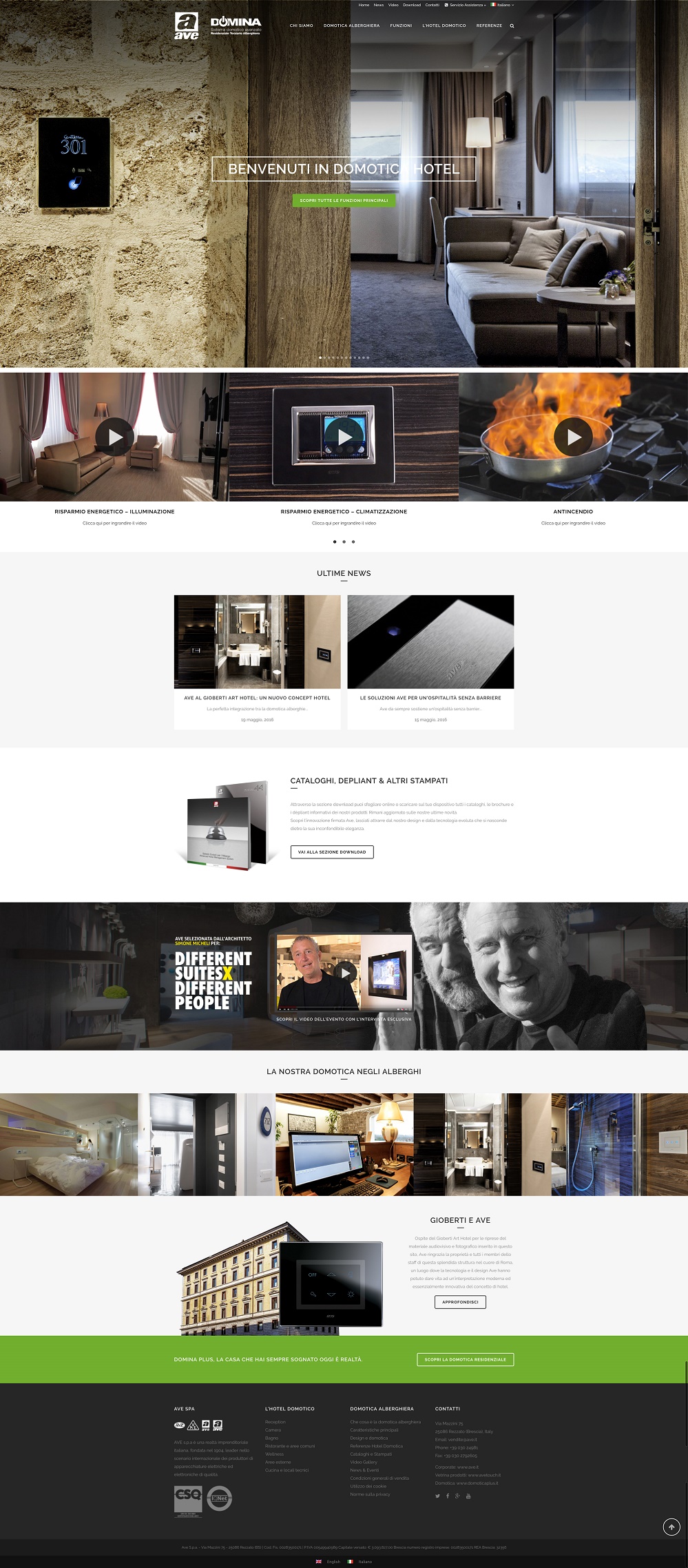 L’azienda ha deciso di puntare sulla domotica alberghiera ed inaugura un nuovo sito internet interamente rivolto a Domina Hotel: www.domoticahotel.com. Marchio di riferimento di Ave per le sue proposte smart dedicate al mondo degli alberghi, Domina Hotel non è soltanto un software di gestione alberghiera, ma un sistema altamente progredito, flessibile ed espansibile, in cui gli ultimi ritrovati nel campo della tecnologia intervengono per rendere le strutture più confortevoli, sicure ed affidabili.