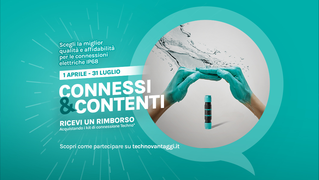 Chi installa Techno guadagna, grazie alla campagna “Connessi & Contenti” che consente di richiedere un rimborso del 15% sul valore dei prodotti Techno acquistati dal 1° aprile al 31 luglio 2023. Con questa promozione Techno intende promuovere la conoscenza dei propri prodotti sul canale elettrico evidenziando le caratteristiche peculiari in termini di qualità e affidabilità per installazioni elettriche in condizioni e ambienti gravosi.