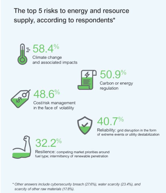 Mitigare gli effetti del cambiamento climatico e del riscaldamento globale e adattarvisi, la spinta alla decarbonizzazione e altre iniziative connesse al tema del clima sono oggi molto più al centro dell’operatività di business che in passato. La ricerca ha evidenziato che la questione ambientale è uno dei principali driver dei programmi di sostenibilità e gestione energetica delle grandi aziende (51,5%) e che il cambiamento climatico è considerato il principale rischio a cui far fronte per quanto riguarda la scelta di come rifornirsi di energia e altre risorse (58%). Nelle aziende il top management sta finalmente iniziando a capire chiaramente che la lotta al cambiamento climatico porta vantaggi: migliore reputazione, nuovi prodotti e servizi e potenziali vantaggi dagli investimenti in quest’area.
