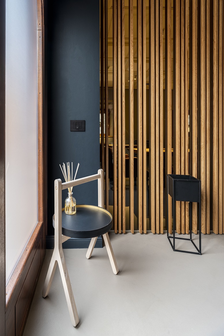 In questo ambiente, luci e ombre sono stati studiati in profondità e danno agli spazi un senso di eleganza e di equilibrio a cui contribuisce anche il design di Linea, la serie civile Vimar lanciata sul mercato a ottobre 2022. Le prese planari e i comandi leggermente curvati sono in armonia naturale con tutti gli ambienti del ristorante. Il quadratino luminoso, caratteristico del tasto, dona un tocco di originalità e risponde alla ricerca di essenzialità e minimalismo che caratterizza la natura del luogo. Anche i colori hanno un’importanza fondamentale in questo progetto: le varianti nera e canapa di Linea sono in perfetta sincronia con l’equilibrio cromatico di Retroscena.