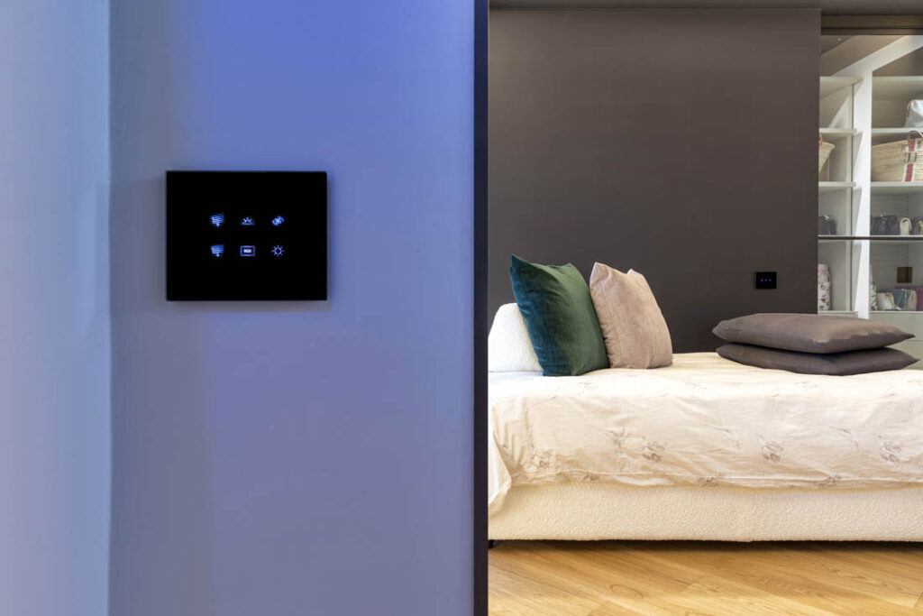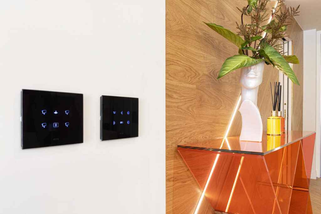 Questo spazio residenziale incarna la perfezione dell’abitare smart. Ogni aspetto della casa è completamente personalizzabile, grazie alla flessibilità offerta dalla tecnologia KNX, che permette di plasmare gli ambienti alle esigenze dei suoi abitanti. Le placche in cristallo di AVE, con il loro design elegante e minimalista, conferiscono un tocco di prestigio e raffinatezza a ogni stanza.